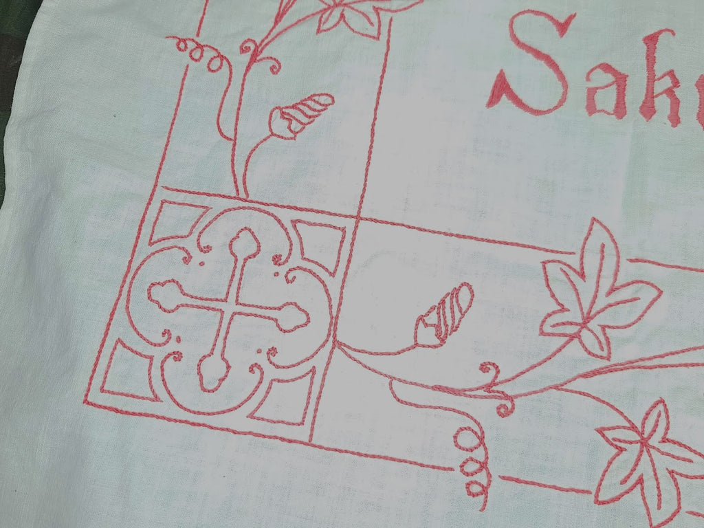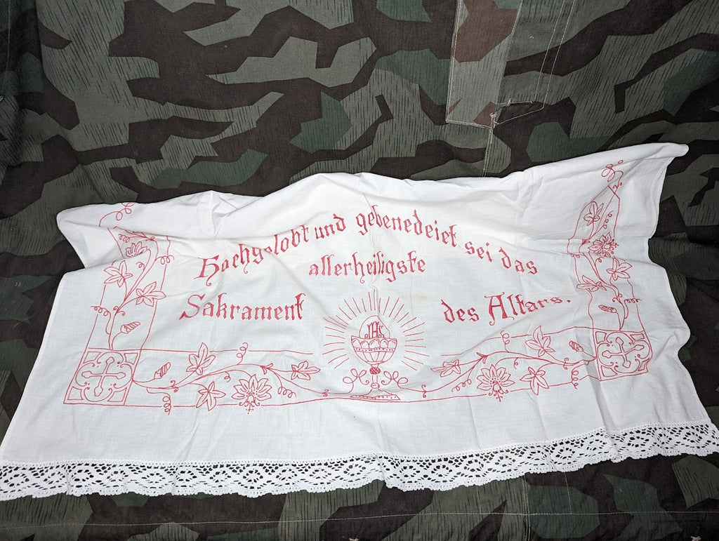 Cloth cover of a church altar for Communion. It is in fairly good condition with a few small light stains. "Hochgelobt und gebenedeiet sei das allerheiligste Sakrament des Altars" translates roughly to "Highly praised and blessed be the most holy Sacrament of the Altar"