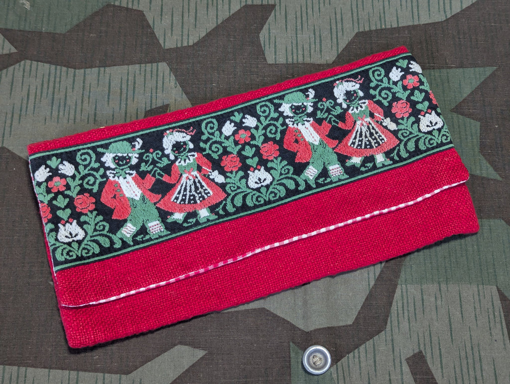 Decorative German linen bag. I usually see these used for travel house shoes or handkerchiefs. It is a nice traditional looking bag in good condition. Might make a great little wrapping for a Christmas gift this year. Not because you're lazy and can't wrap a package of course; this is just a better, more thoughtful, packaging system for your gift. Age is unclear but its at least vintage. I find many similar bags which are pre war but I am pretty sure this is newer.