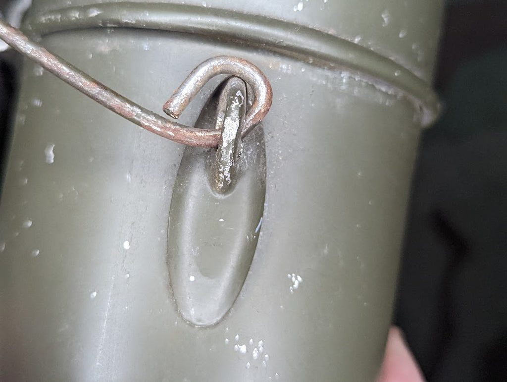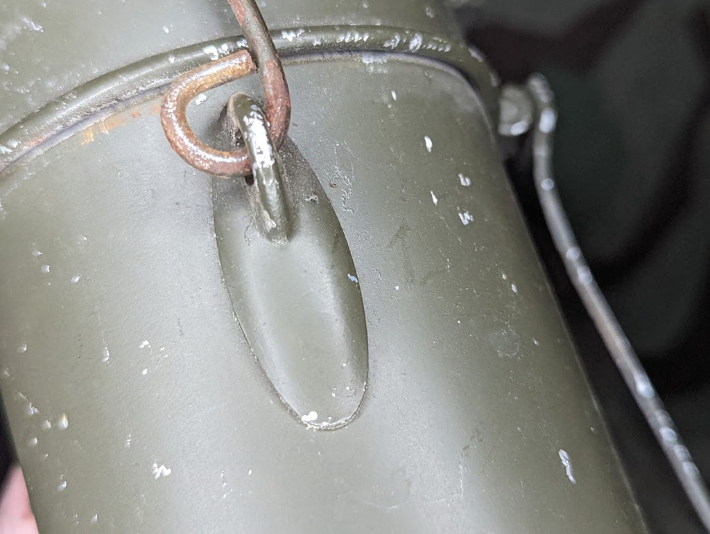 Post war made mess kit which is the same style and size as the WWII German model. In fact, its very close to the WWII model except for having 3 rivets where the handle attaches to the lid rather than only 2 rivets. It is in nice condition and the paint color is actually quite usable for WWII. - ← Previous Product Next Product →