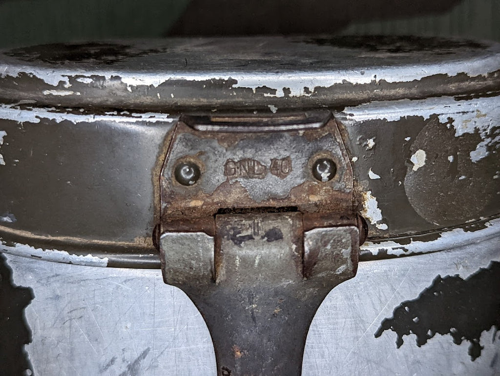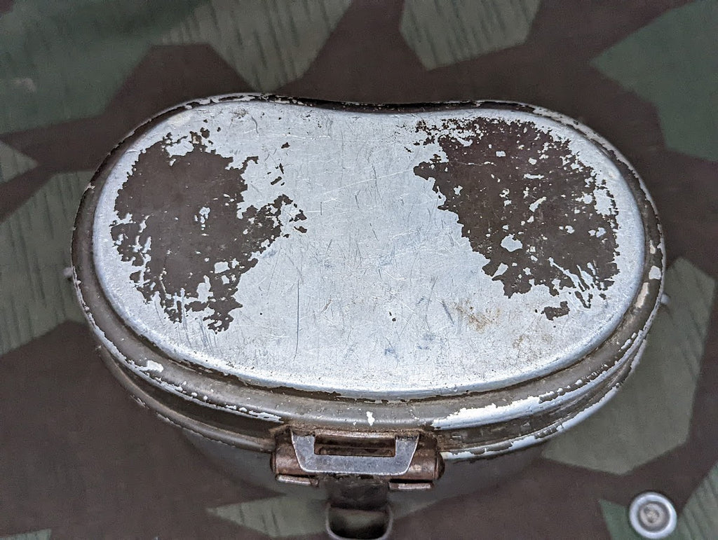Nice German mis-matched mess kit. There are some very old looking food remnants inside so it really needs cleaned. The food doesn't look like it damaged the aluminum (I often see various foods or mold from foods chew through aluminum).