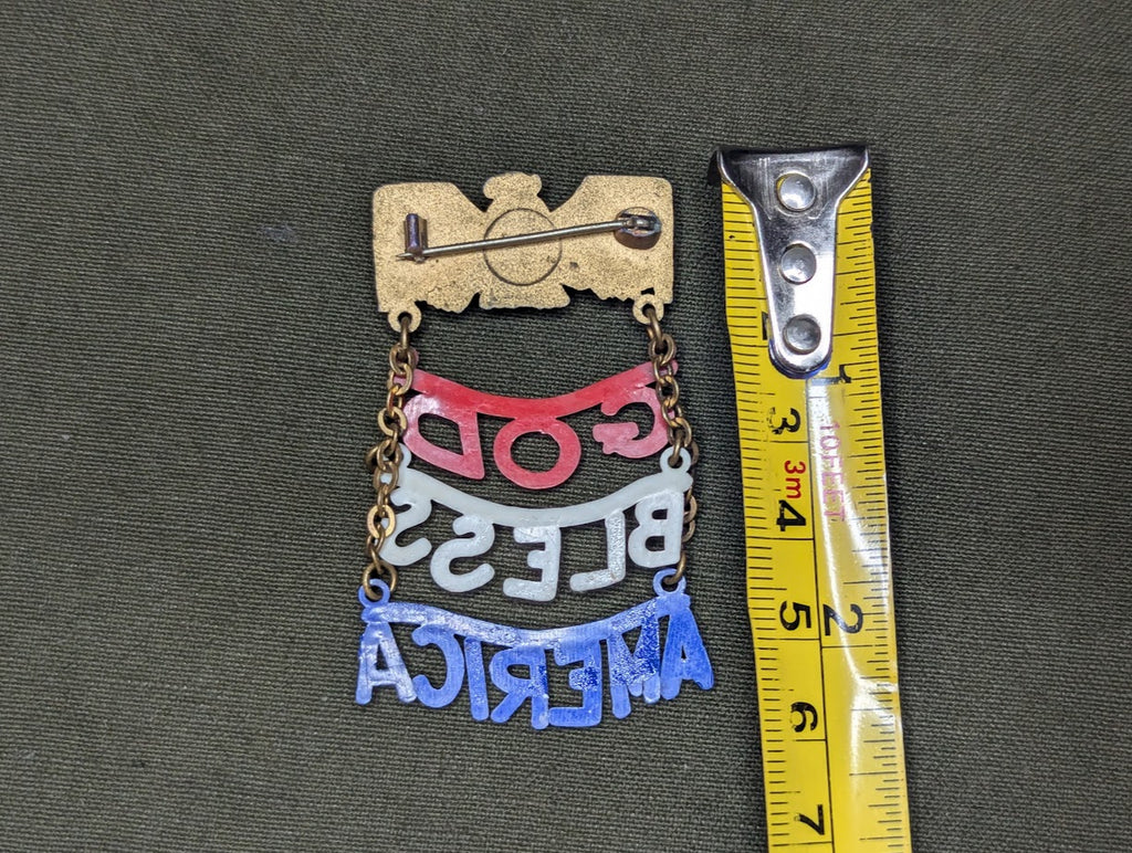 Vintage WWII God Bless America pin. The pin is made of an early plastic and is a bit delicate. The words are red, white and blue and dangle from a gold painted eagle. Overall good condition with light wear.