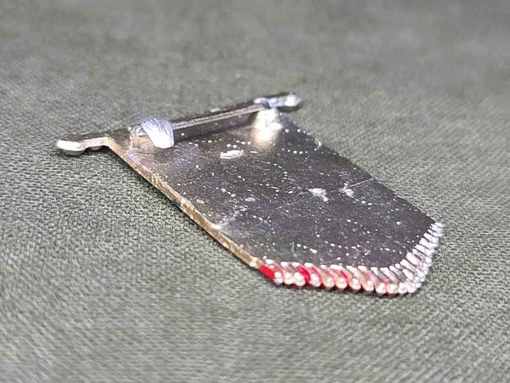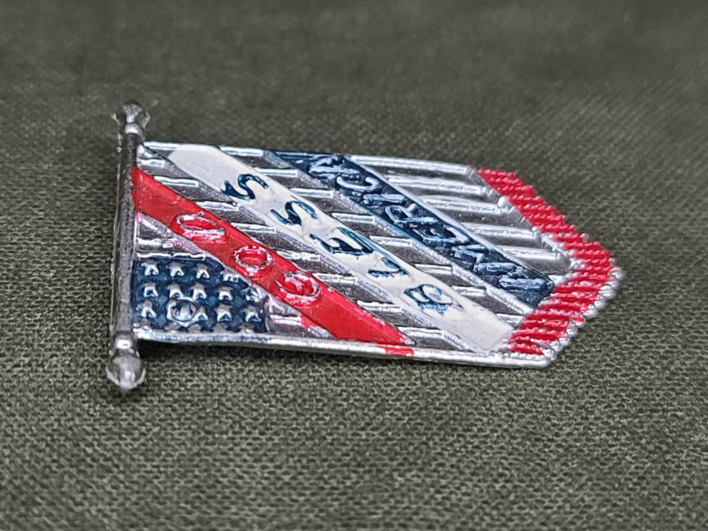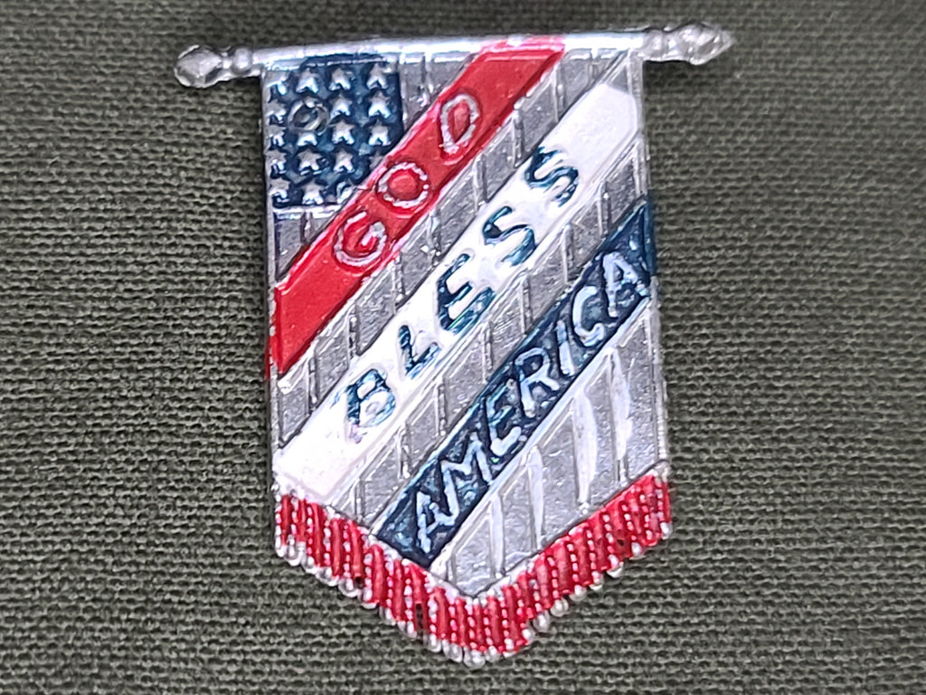 Vintage WWII "God Bless America" pin. Red white and blue patriotic colors with a hanging American flag background and a fringe like design on the bottom. There are no markings. This looks to be made of a cheaper pot metal in accordance with rationing. Overall good condition. - ← Previous Product Next Product →