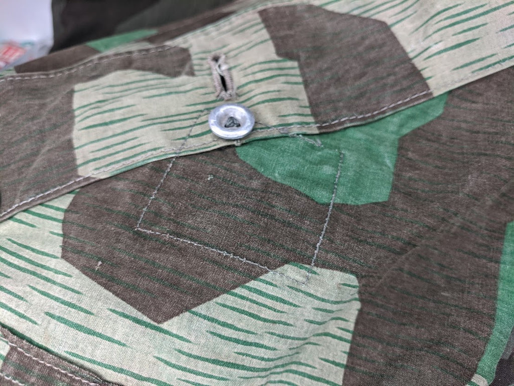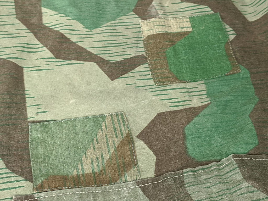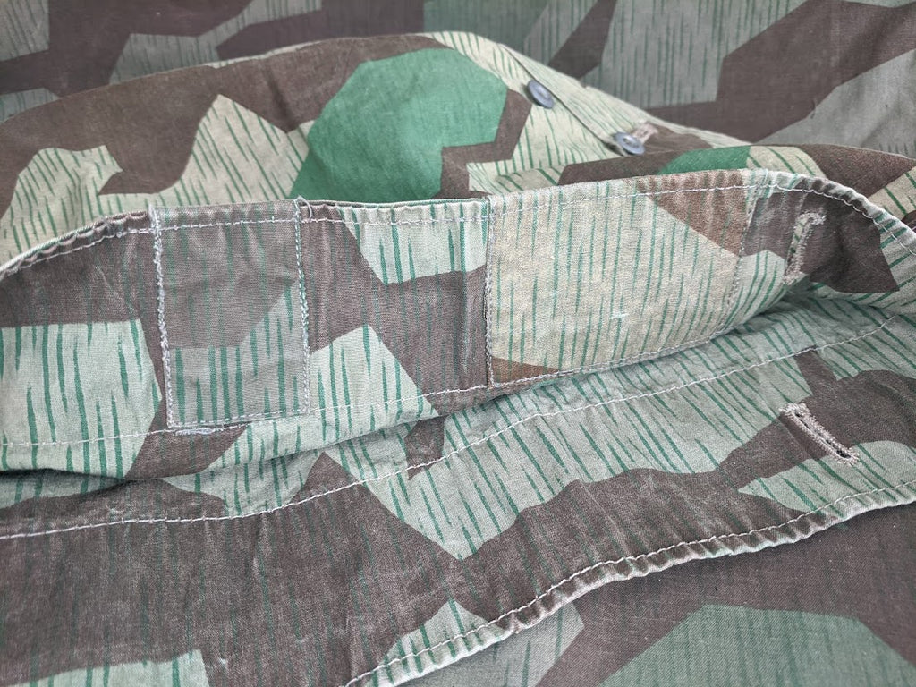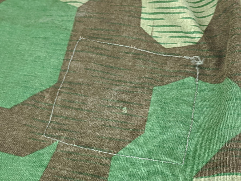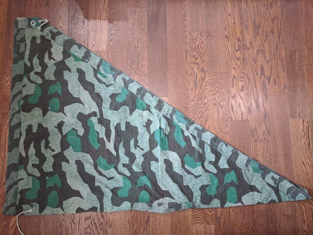 Very interesting zeltbahn for a collector of variations. The maker stamp is Deutsche Bekleidungs-Werkstätten. It is basically complete and in good condition. The bottom most buttons are missing. There are a number of extremely well done repairs which appear to be factory done and these repairs are over top of minuscule defects in the fabric, which most end users would probably not have even noticed or cared about, but which would have likely been cause for concern in a quality control setting. This indicates to me that the zeltbahn was made and likely then rejected due to these defects, but because nothing is wasted in wartime Germany, the zeltbahn was then repaired. It is possible that this was done at the original factory but it seems more likely to me that the defective zeltbahn was sent on to a subcontractor for repairs. I have uncovered a number of such unusual, almost surplus like, markets in wartime Germany with smaller shops or networks of shops performing repairs or recycling surplus material. Its a very fascinating and seldom discussed part of the German wartime economy. This seems to be confirmed with the unusual markers stamp and lack of a normal manufactures stamp.