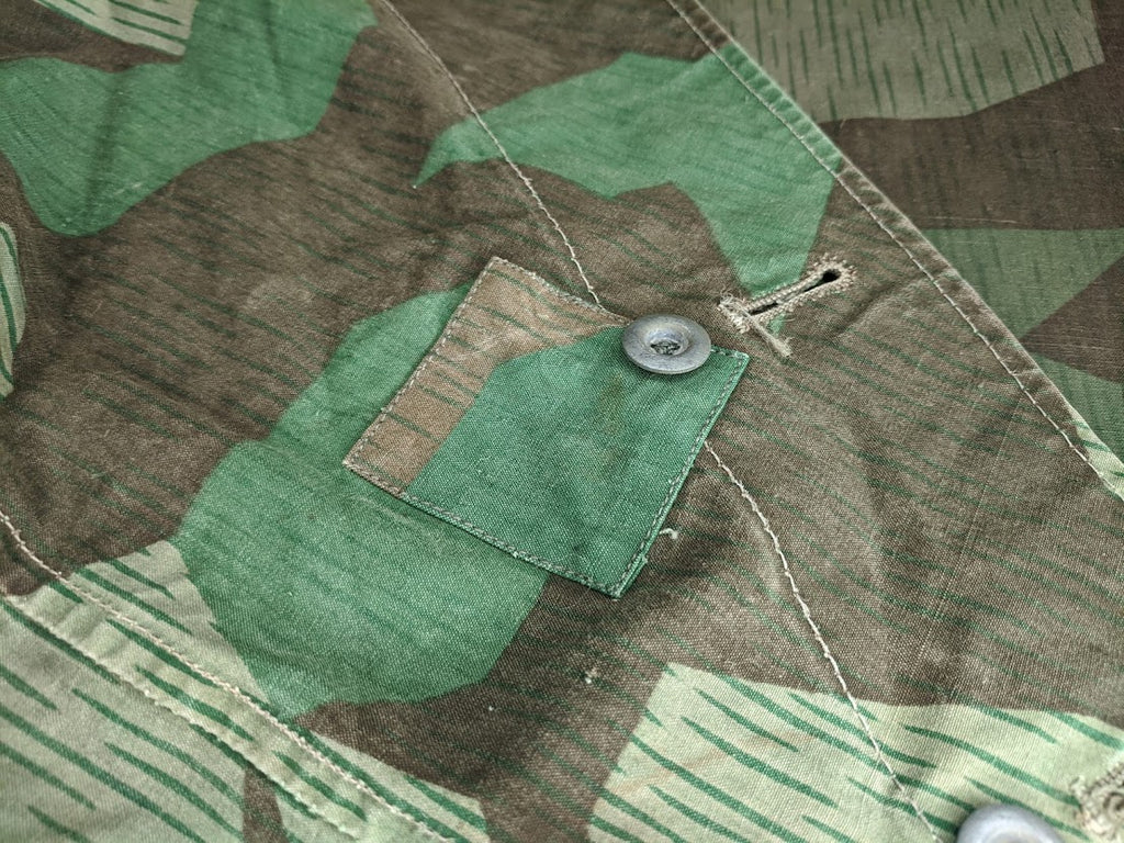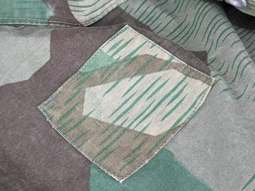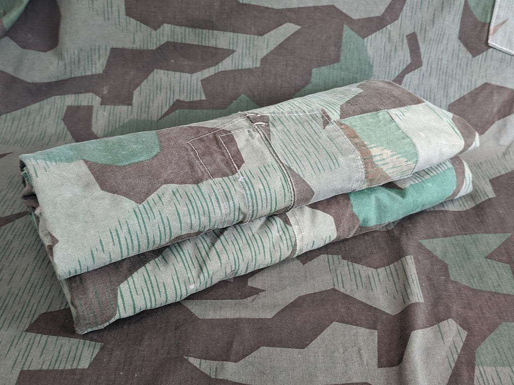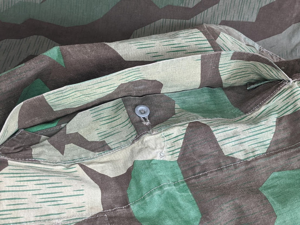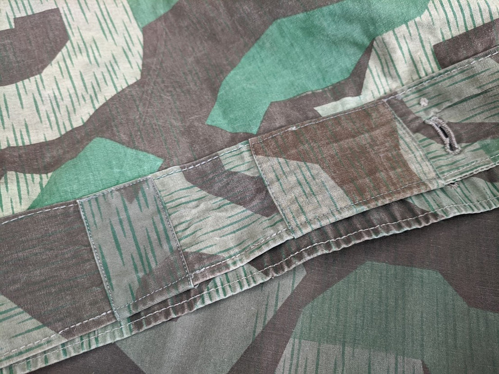 Very interesting zeltbahn for a collector of variations. The maker stamp is Deutsche Bekleidungs-Werkstätten. It is basically complete and in good condition. The bottom most buttons are missing. There are a number of extremely well done repairs which appear to be factory done and these repairs are over top of minuscule defects in the fabric, which most end users would probably not have even noticed or cared about, but which would have likely been cause for concern in a quality control setting. This indicates to me that the zeltbahn was made and likely then rejected due to these defects, but because nothing is wasted in wartime Germany, the zeltbahn was then repaired. It is possible that this was done at the original factory but it seems more likely to me that the defective zeltbahn was sent on to a subcontractor for repairs. I have uncovered a number of such unusual, almost surplus like, markets in wartime Germany with smaller shops or networks of shops performing repairs or recycling surplus material. Its a very fascinating and seldom discussed part of the German wartime economy. This seems to be confirmed with the unusual markers stamp and lack of a normal manufactures stamp.