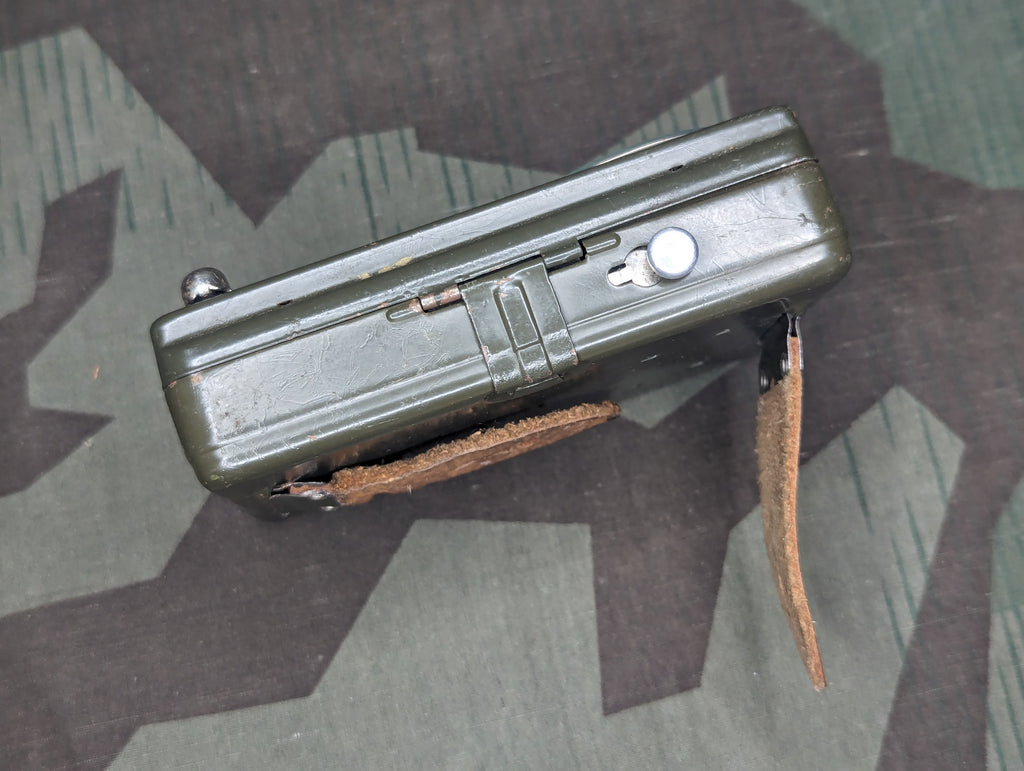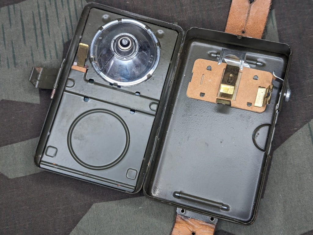Post war Daimon flashlight that is an appropriate style for WWII. It has red and green lenses. In rather good condition, but the red lens looks to be missing a small chunk which appears to be stuck to the green lens; this does make the lenses a little difficult and sticky to operate. - ← Previous Product Next Product →