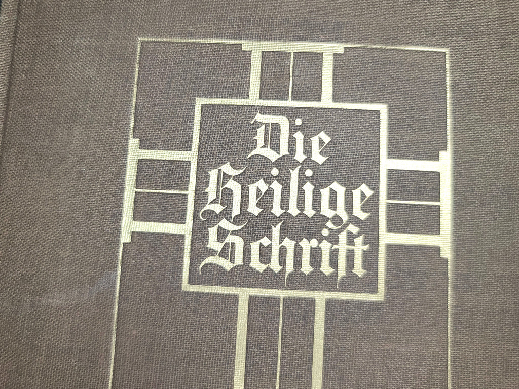 Vintage Heilige Schrift - complete protestant Bible: Old and New Testaments. The bible itself is date 1933 and there is a paper from a wedding in 1935 as bibles were common wedding gifts. Larger size. Overall, fairly good condition with some wear and a little bowing. - ← Previous Product Next Product →