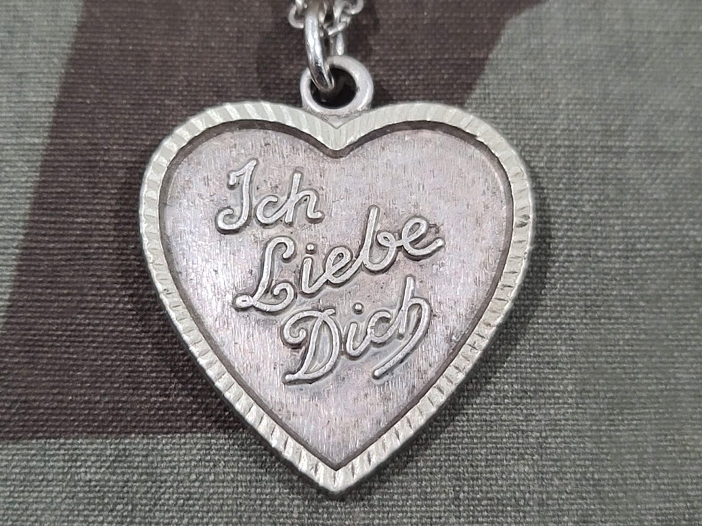 Vintage German heart necklace. "Ich Liebe Dich" (I love you) on one side and St Christopher on the other. Overall good condition. - ← Previous Product Next Product →