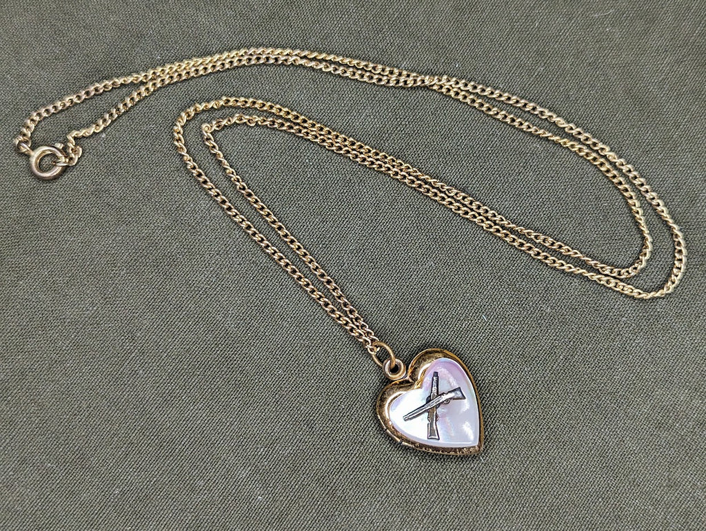 Vintage WWII US Army infantry sweetheart locket necklace. Crossed rifle insignia on a mother of pearl heart. It has some wear and discoloration. The rifle insignia can move around a bit.
