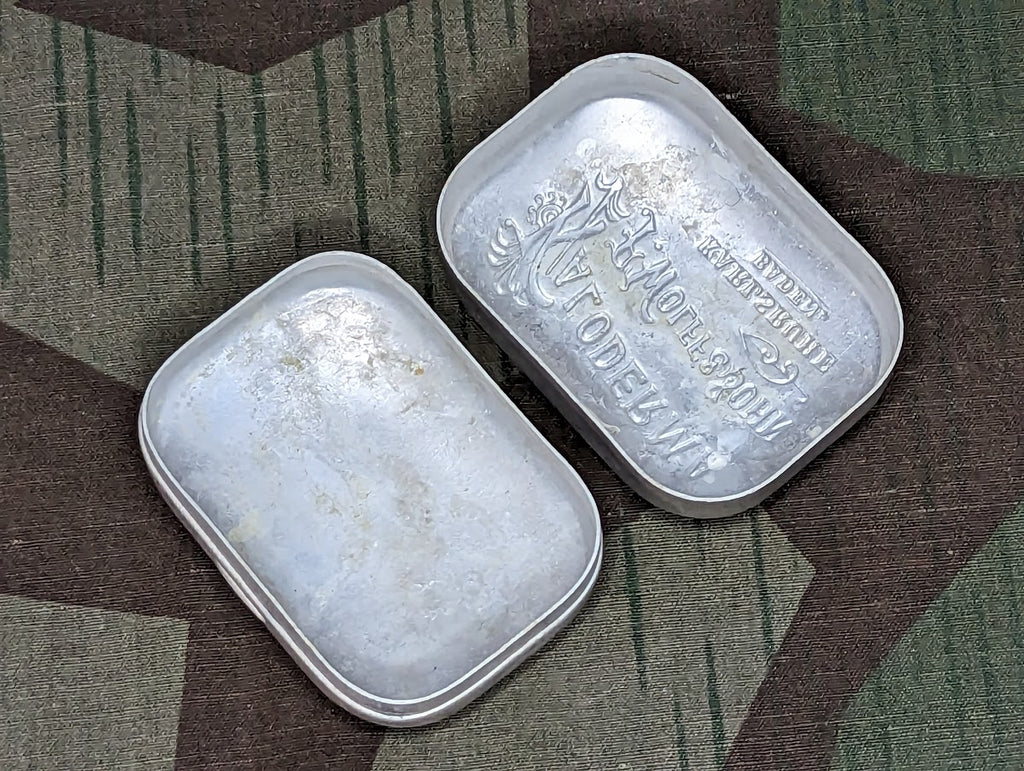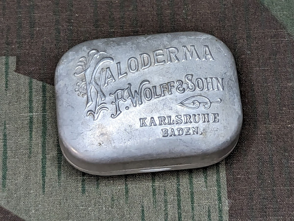 Original tiny aluminum Kaloderma travel soap container. It is in good condition with nominal wear. - ← Previous Product Next Product →