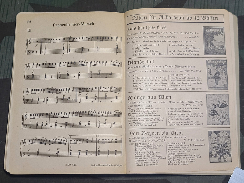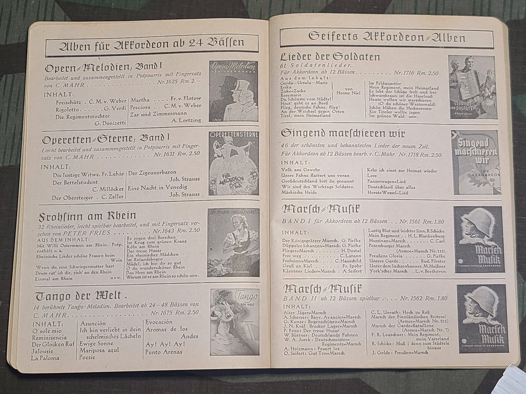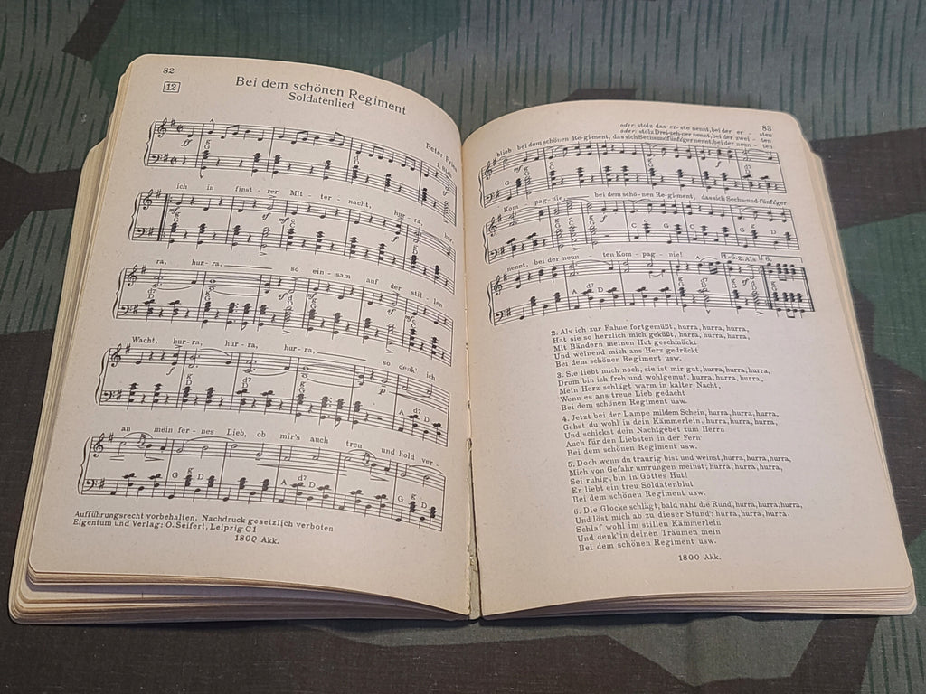 Original WWII German "Kamerad Sing Mit" soldiers song and march book for accordion. Lyrics and music notes. It is in fairly good condition; there is some wear on the spine. It has most all the favorites (Erika, Lili Marleen, Morgan marschieren wir, Preußens Gloria, etc).