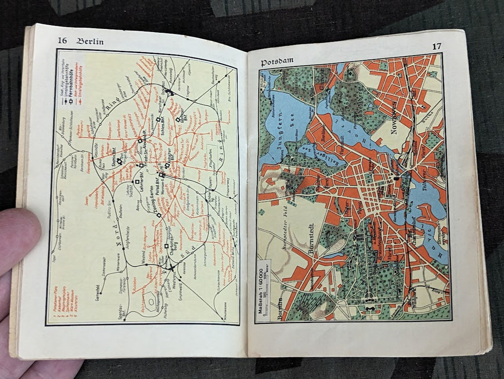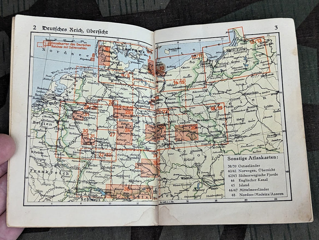 Original 1930's Kraft Durch Freude, ("strength through joy") Taschen Atlas pocket atlas. Even you can now travel! On the back it says, strength through joy, joy through travel, travel through saving. It contains detailed maps of areas in Germany as well as some broader maps of certain areas of Europe. It is in OK condition. It shows general wear and staining.