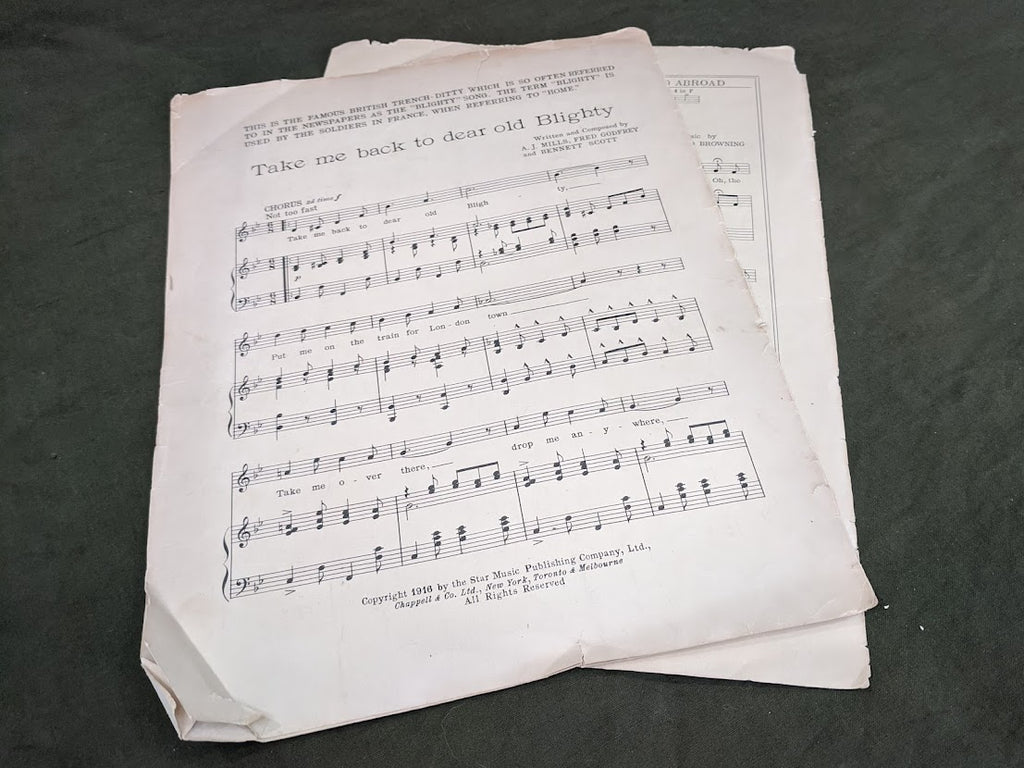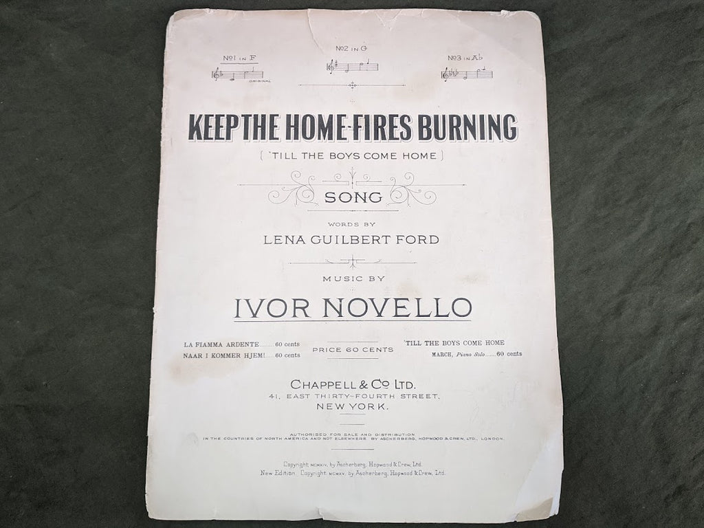 Keep the home fires burning till the boys come home WWI sheet music. Its essentially just 2 sheets. Poor condition. The outer sheet is torn along the spine. I am unsure if it is missing pages. Sold as found. - ← Previous Product Next Product →
