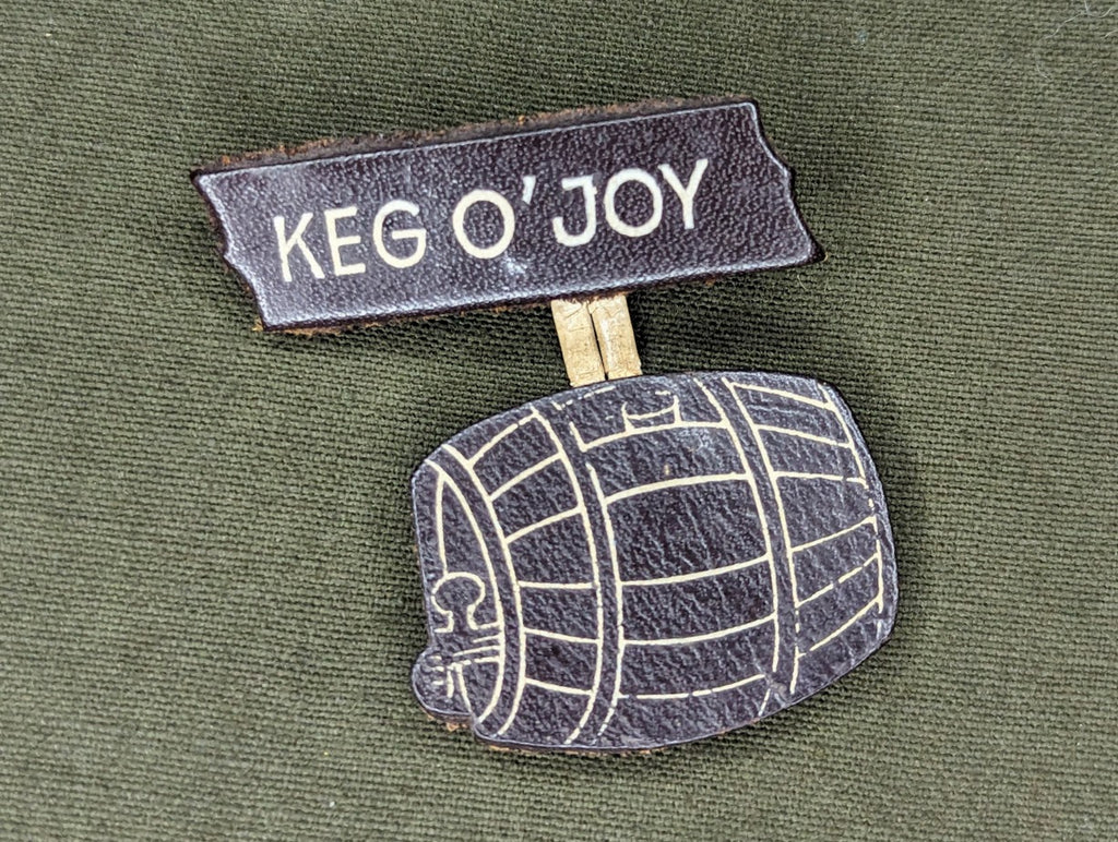 Vintage 1940s Keg O' Joy novelty beer keg pin. Made of leather. Some wear on the connecting pieces. The pin is marked "Pat Pend". Overall decent condition, but still a little delicate. - ← Previous Product Next Product →