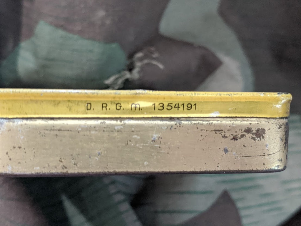 Original German cigarette tin for Khedive Exquisit cigarettes. This tin is actually DRGM marked which you don't often see. Its in fairly good condition with some wear. Would make a great reenacting cigarette case. - ← Previous Product Next Product →