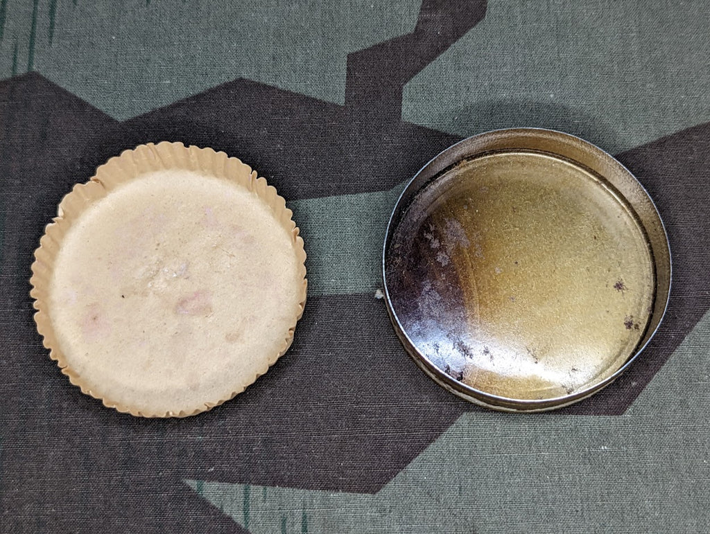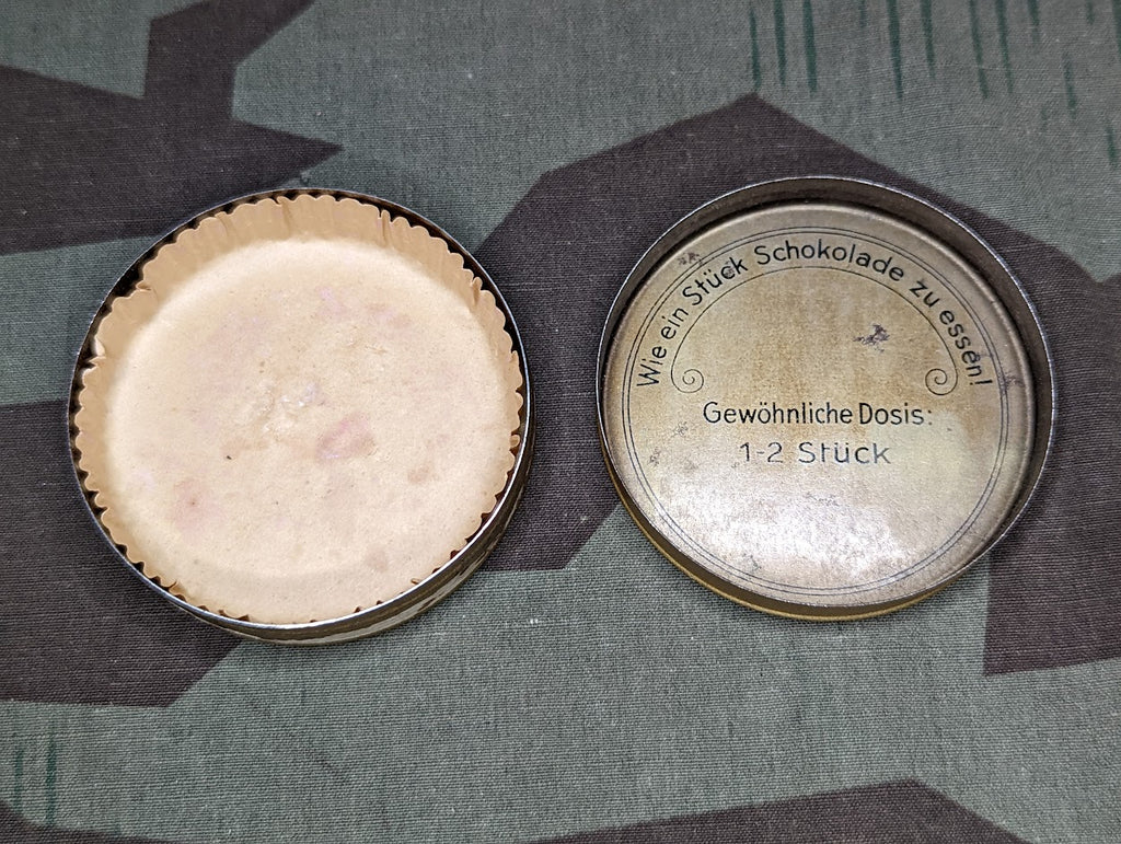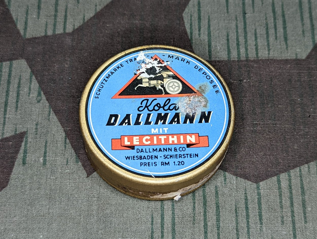 Kola Dallmann mit Lecithin energy drops tin. This contained small tablets of caffeine that you were just supposed to eat, like a piece of chocolate. A comfortable dose is 1 -2 pieces. The price is in RM (Reichsmarks). There is some damage on the front, otherwise it is in good shape.