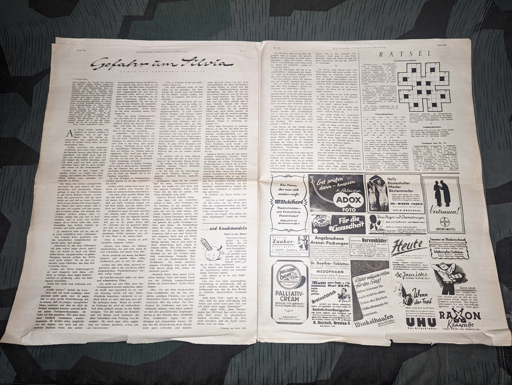 Kölnische Illustrierte Zeitung from April 6 1944. Original illustrated newspaper from Koln. Only about 3 sheets of news print, so not an extensive newspaper. Fairly good condition with a crease in the center.