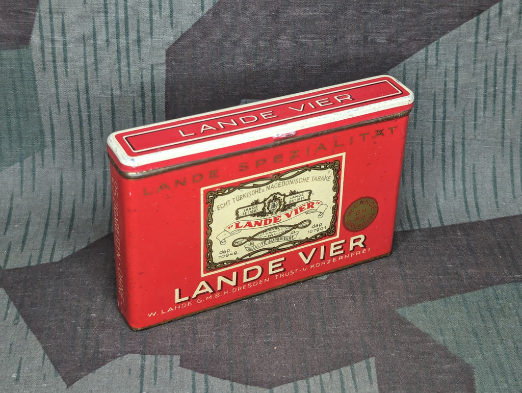 Period German Lande Vier 25 cigarette tin from Dresden. Ideal pocket stuffer. Nice tin in fairly good condition. It also has a rather interesting design for the period. - ← Previous Product Next Product →