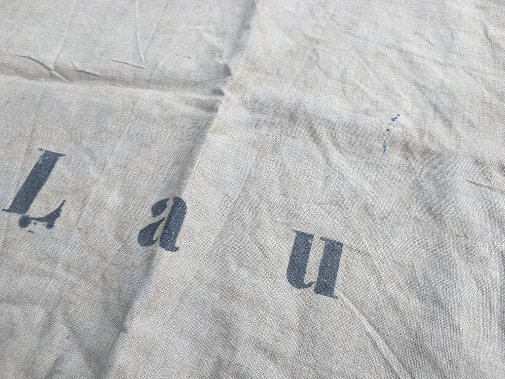 Large linen grain sack or goods bag with grommets on top to close it. There is a small hole and some dirt/stains. Would be a very useful item in camp to hide many different things or for hauling your gear. - ← Previous Product Next Product →