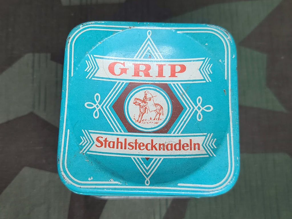 Period German Grip Stahlstecknadeln tin for sewing pins. This is a large bulk pin tin. It is in lightly worn condition with nice graphics. - ← Previous Product Next Product →