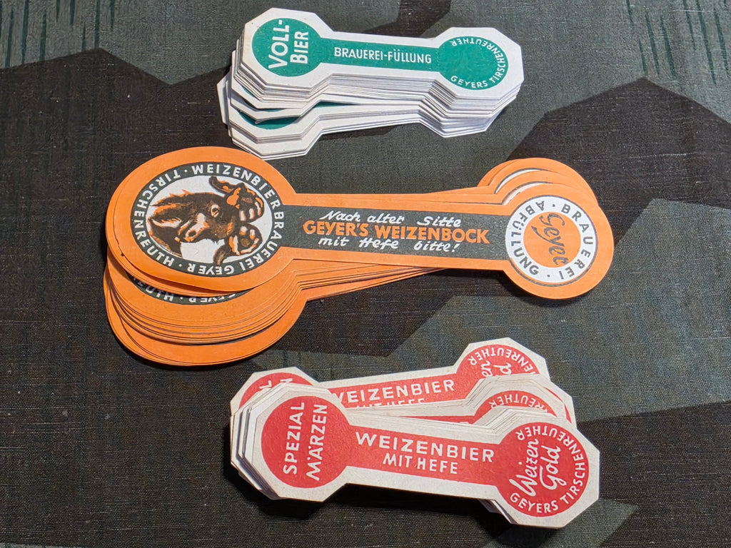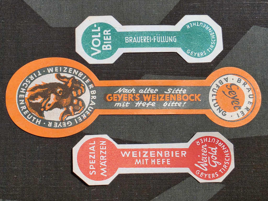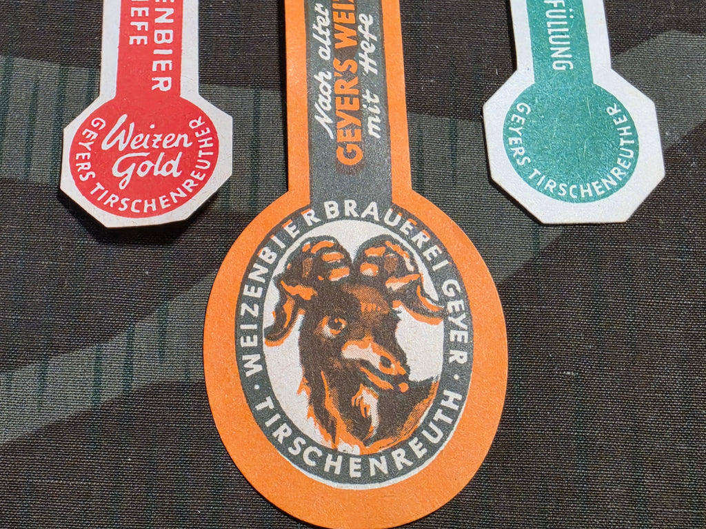 Large lot of vintage new old stock Geyers beer labels. There are about 30 of the larger orange label with the goat and about 50 each of the two smaller labels. I didn't thoroughly count them, so there may be some extra in there. Overall good condition. I am unsure of the exact era, but they are passable for events in any case.