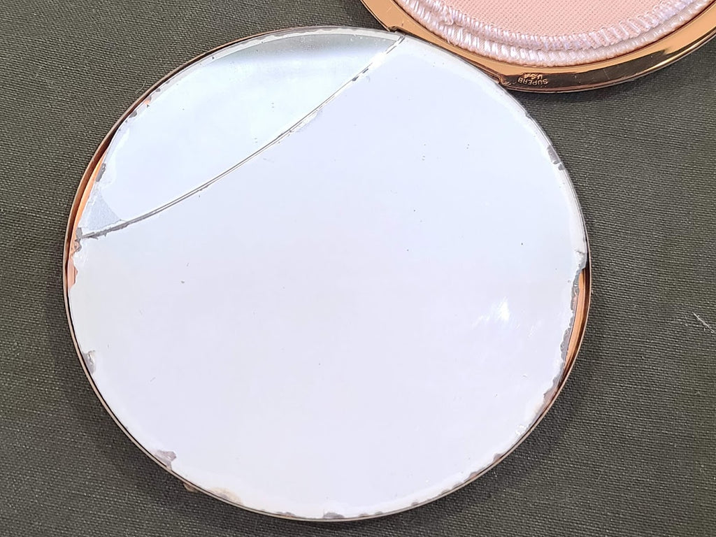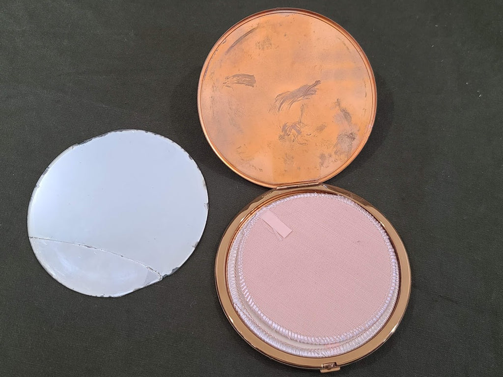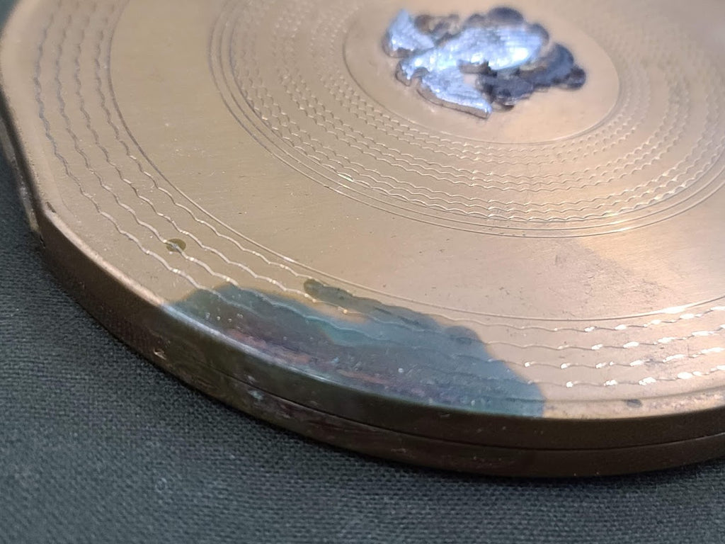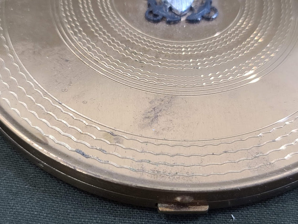 Vintage 1940s WWII US Navy large sweetheart compact. It is fair condition with some flaws. There is discoloration in places. The mirror is loose and cracked; it is being held together by tape. The makeup portion looks unused. It was stored with vintage perfume so it may have some lingering perfumey scent. - ← Previous Product Next Product →