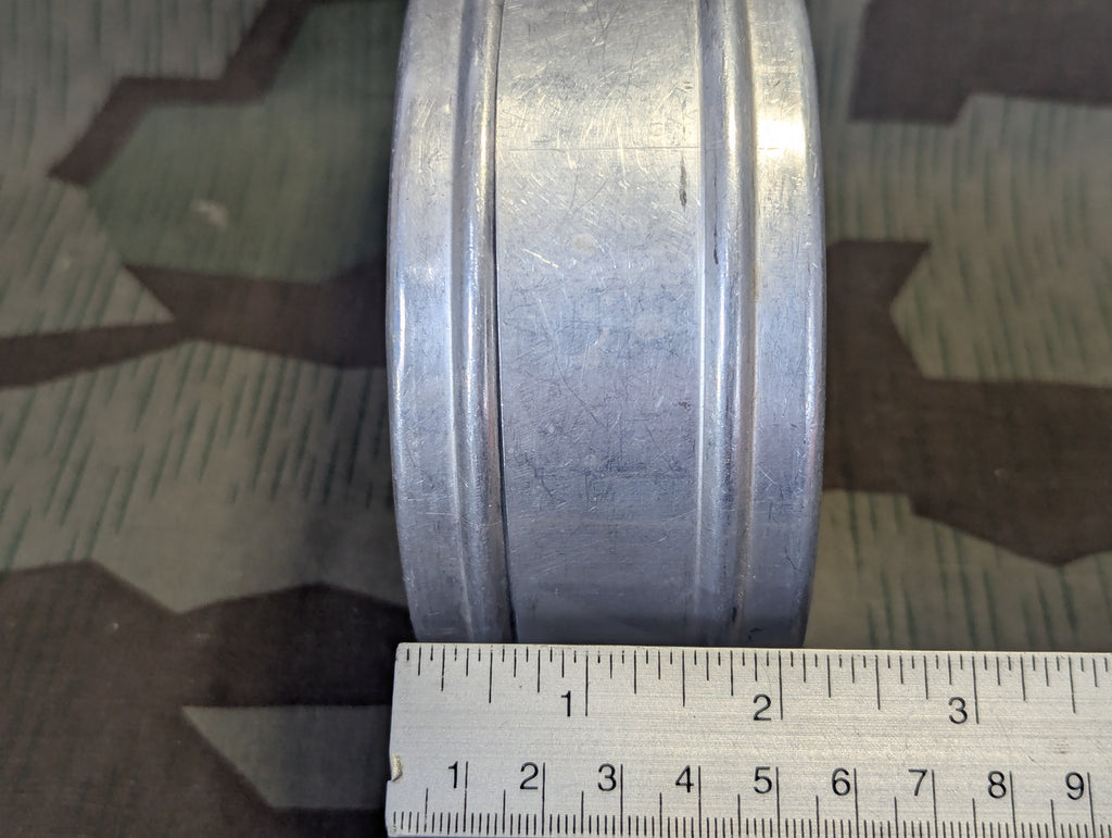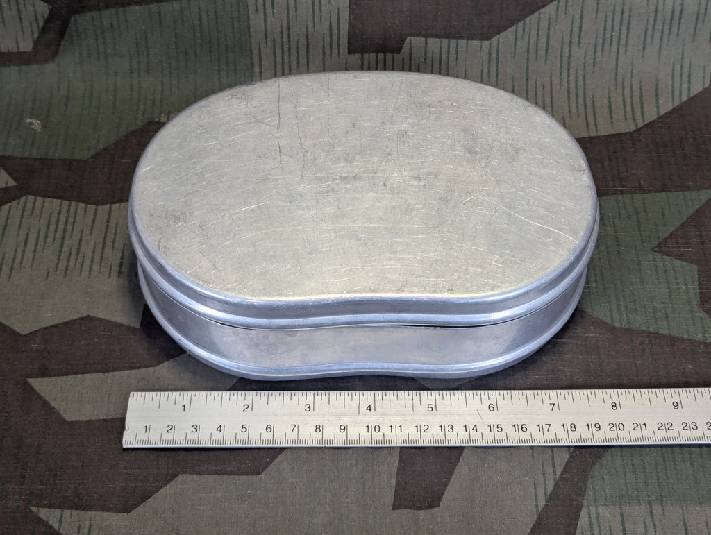 German aluminum bread/sandwich tin. It is in fairly good condition with only light wear. A good bread bag stuffer to keep your sandwich safe. These were an important part of everyday life for Germans, so it is no wonder they found their way to the front lines as well. They were even being produced as early as WWI.