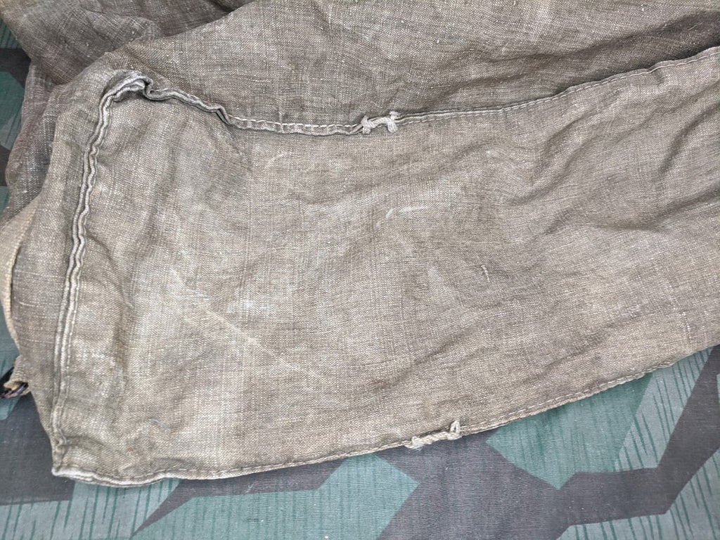I am unsure what exactly this rucksack is. It could be early post war, made from scraps or it could be extremely late war. It appears to be made from a verity of components including the main body of a standard rucksack with British material and hardware for the shoulder straps. It doesn't seem like someone cut up the rucksack to make this, It seems more like it was made from an incomplete rucksack. It is not marked. I do suspect that this is very very late war as the manufacturer bothered to try to create makeshift Tornister strap loops on the sides and top of the ruck. An interesting and strange piece. - ← Previous Product Next Product →