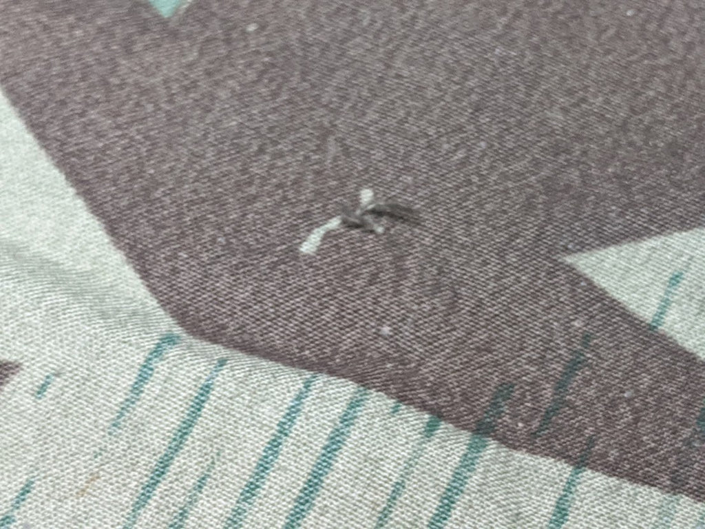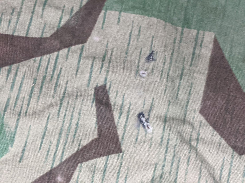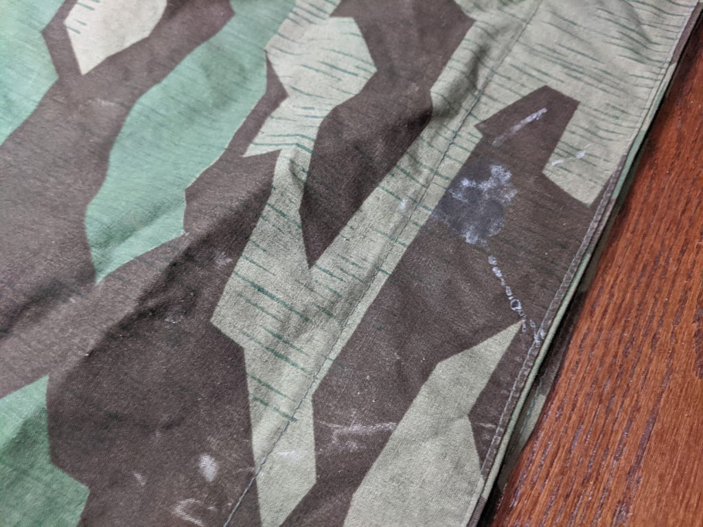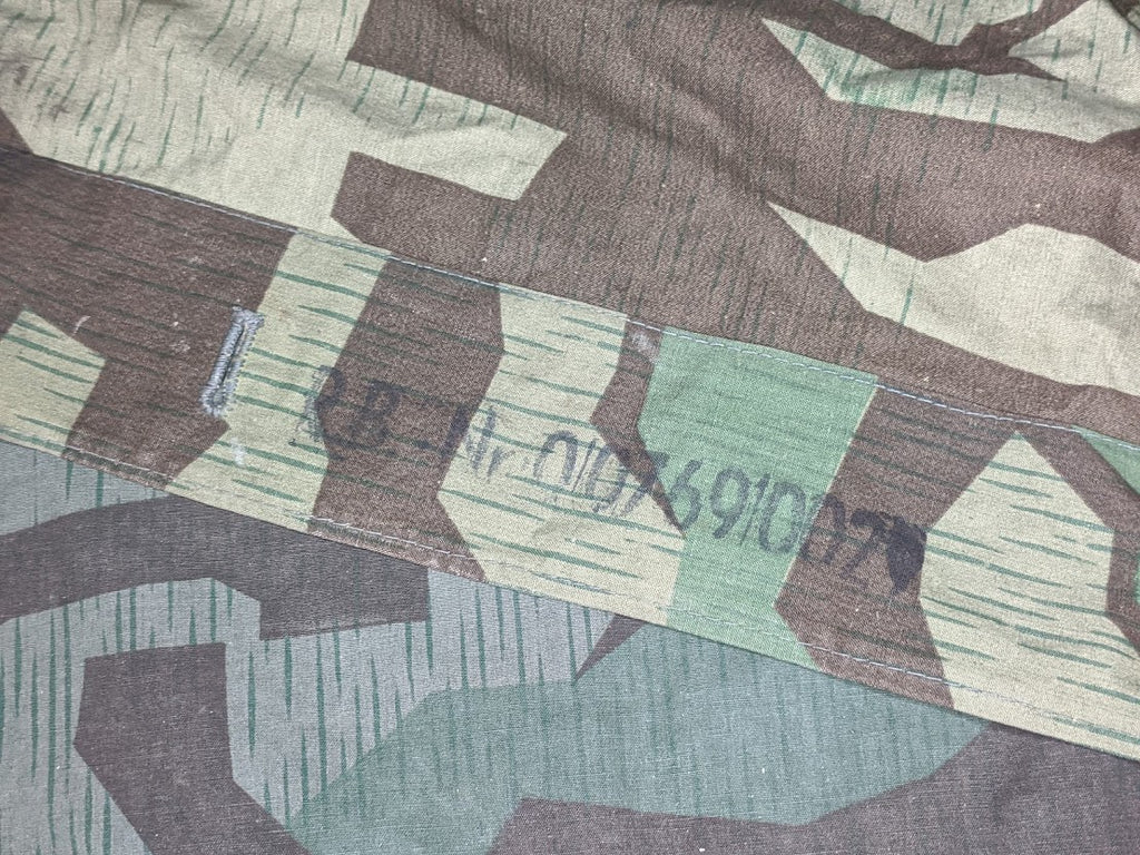 This is a neat late war zeltplanne or zeltbahn with the manufacturers R.B.Nr.0/0769/0029 stamp in huge print. This is the only zeltbahn I have ever seen which appears to have only a single tone of camouflage, both sides appear to be the same shade. All of the buttons have been removed. The buttons look like they were removed very early on as this probably would have had steel buttons and there is no rust staining from steel buttons. There are some stains of various kinds (candle wax, grease or oil, general stuff) and some scuffs. Generally speaking it is a nice looking zeltbahn which still has fairly vibrant colors. There are a few very small holes which appear to have been caused by rubbing or being pinched in something.
