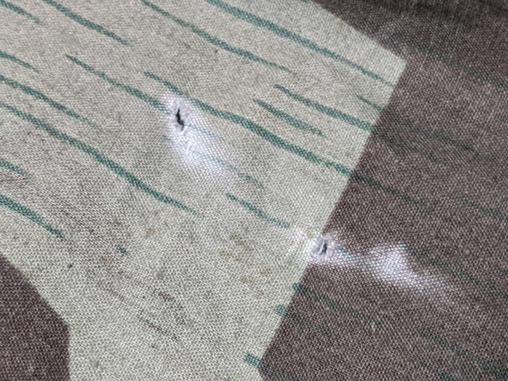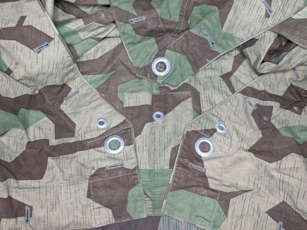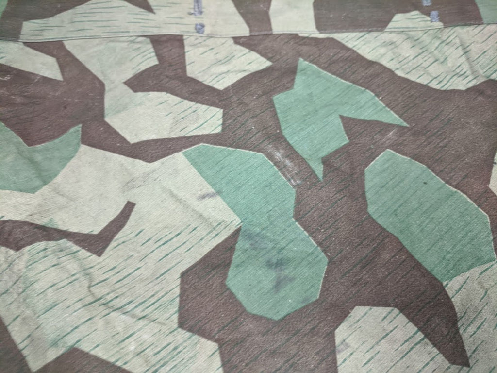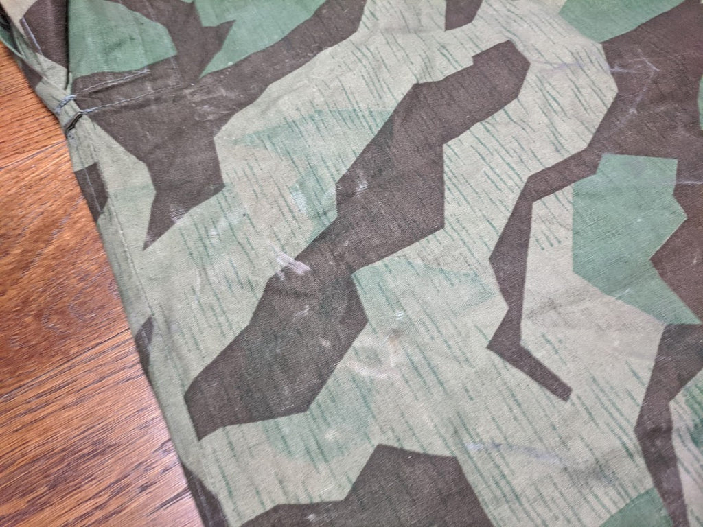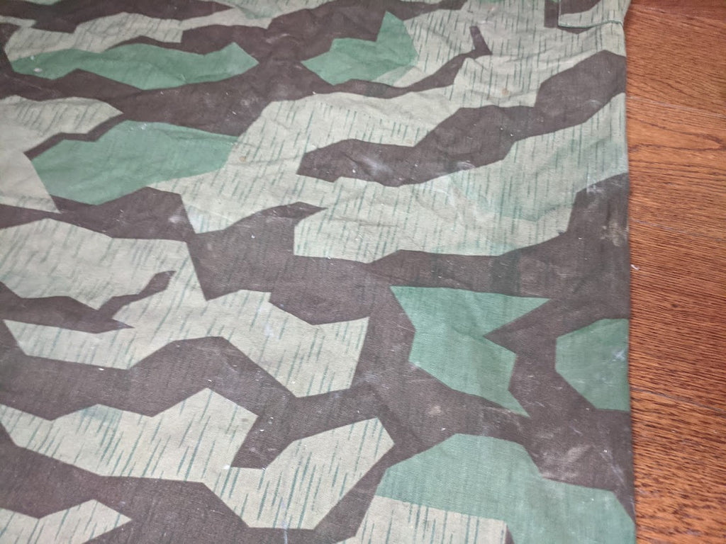 The two sides are virtually identical in base color. There is no darker or subdued side. I tried to take some comparison pictures, even in person it is very difficult to see much of any difference in the two sides. Maybe one side is a hair darker, maybe, its just too close to call. This doesn't appear to have been caused by fading or anything like that, it was just printed the same on both sides. The material is lighter weight and the print from one side bleeds through to the other and vice versa. This is likely a 1944 or 45 produced piece. The buttons were probably cut off in the post war period to use for other garments or simply to stop them catching on things. I know that farmers in Germany were still wearing zeltbahns to work the fields into the 60's.