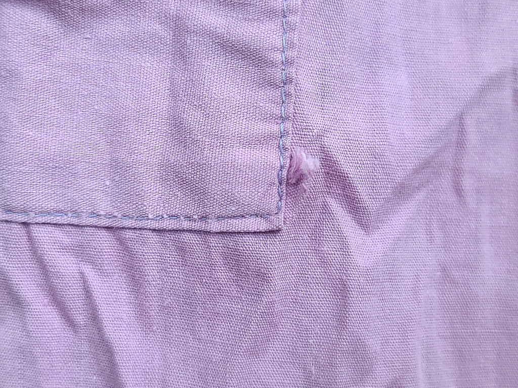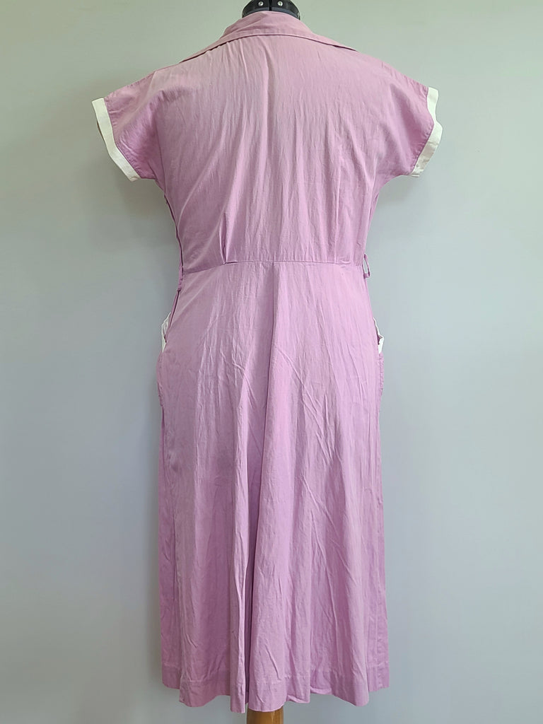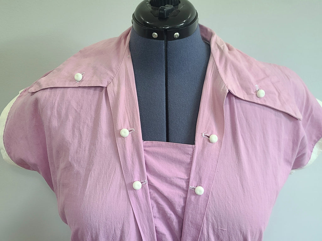 Length - 45 1/2"Nice dress with pockets. Side metal zipper. The buttons are for decoration only and are held in place by safety pins. The white trim has a waffle pattern that pairs well with the pattern on the buttons. Fairly good condition with some wear. There is some light general fading. Small tear under the collar by one of the buttonholes. A few areas of seam separation (an easy fix), some frayed fabric by a pocket that didn't get hidden when the pocket was sewn on. A few faint stains (very hard to see). Some pulls in the material.