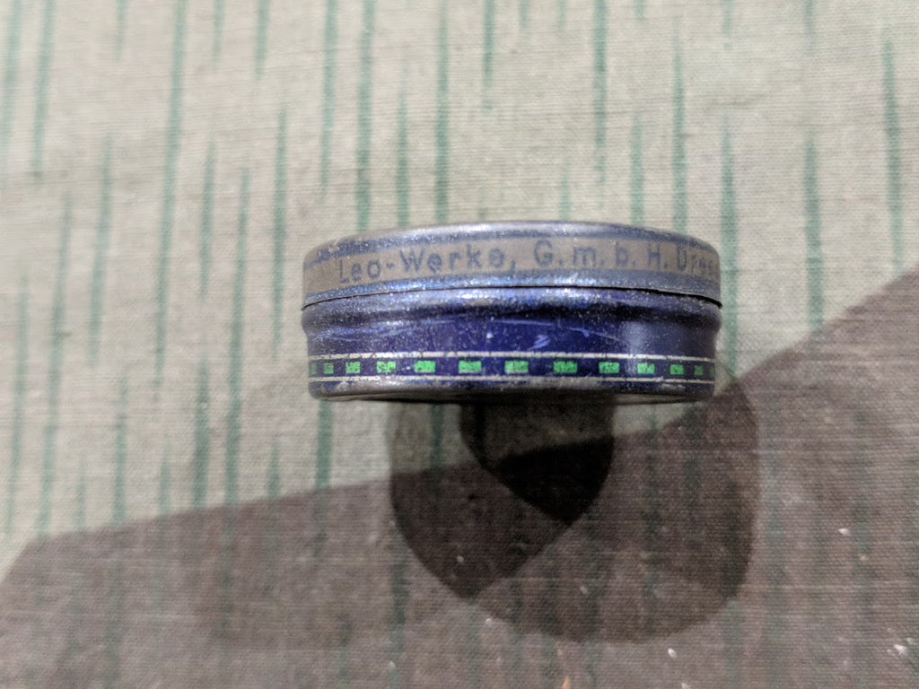 Original Leokrem skin cream tin made by Chlorodont in Dresden. It is a small tin, marked "Probedose" (trial container). It is supposed to keep skin soft and young-looking and help you tan rather than burn. It is worn and a little rusty. It measures a little over 1 1/4" in diameter. - ← Previous Product Next Product →