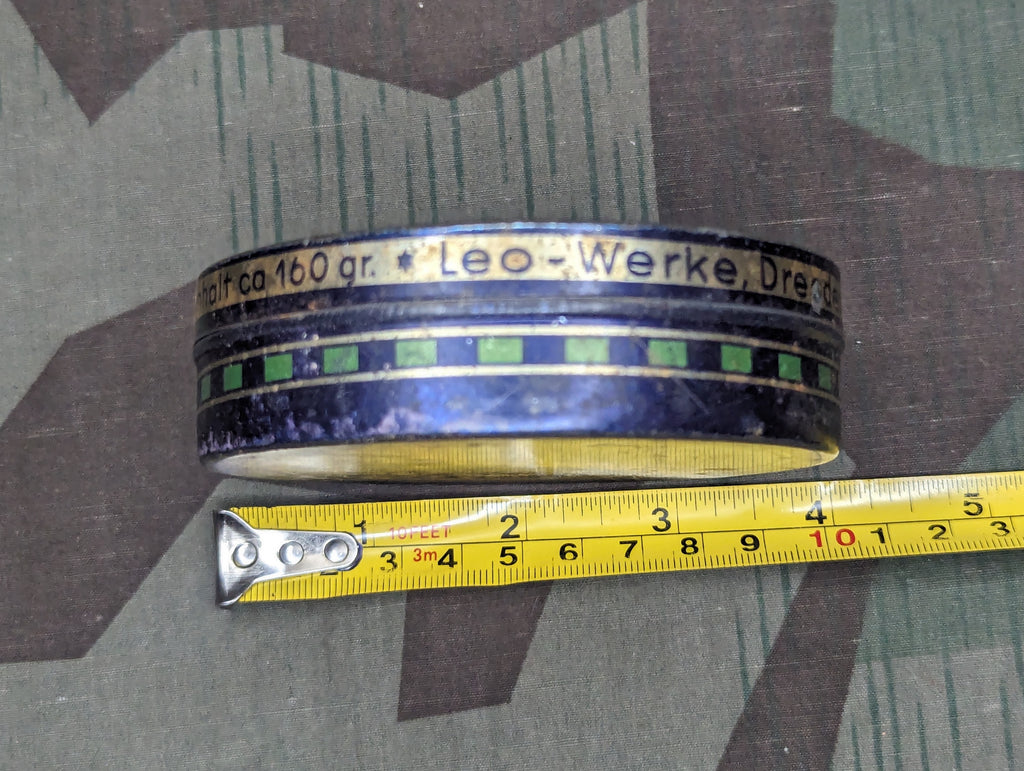 Original Leokrem skin cream tin made by Leo-Werke in Dresden. The price is in RM (Reichsmarks), but this is obscured by a bit of paper residue from the original seal. This is a nice example and rather clean. - ← Previous Product Next Product →