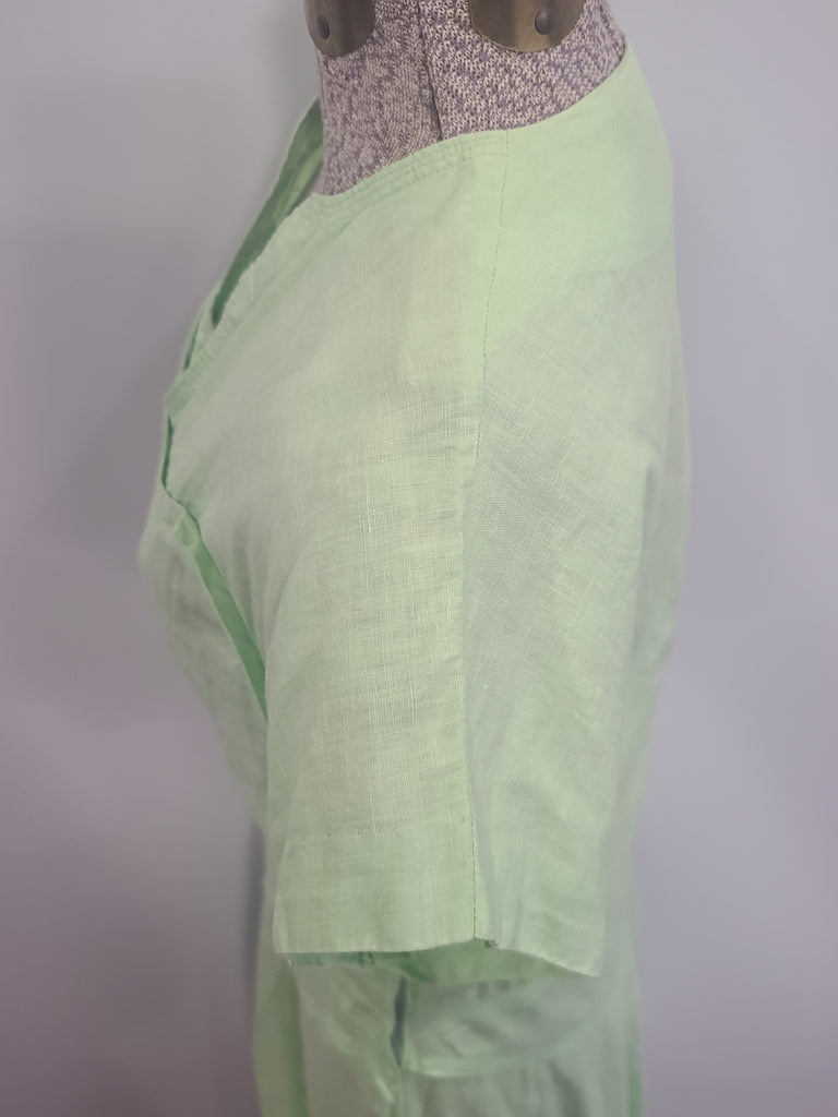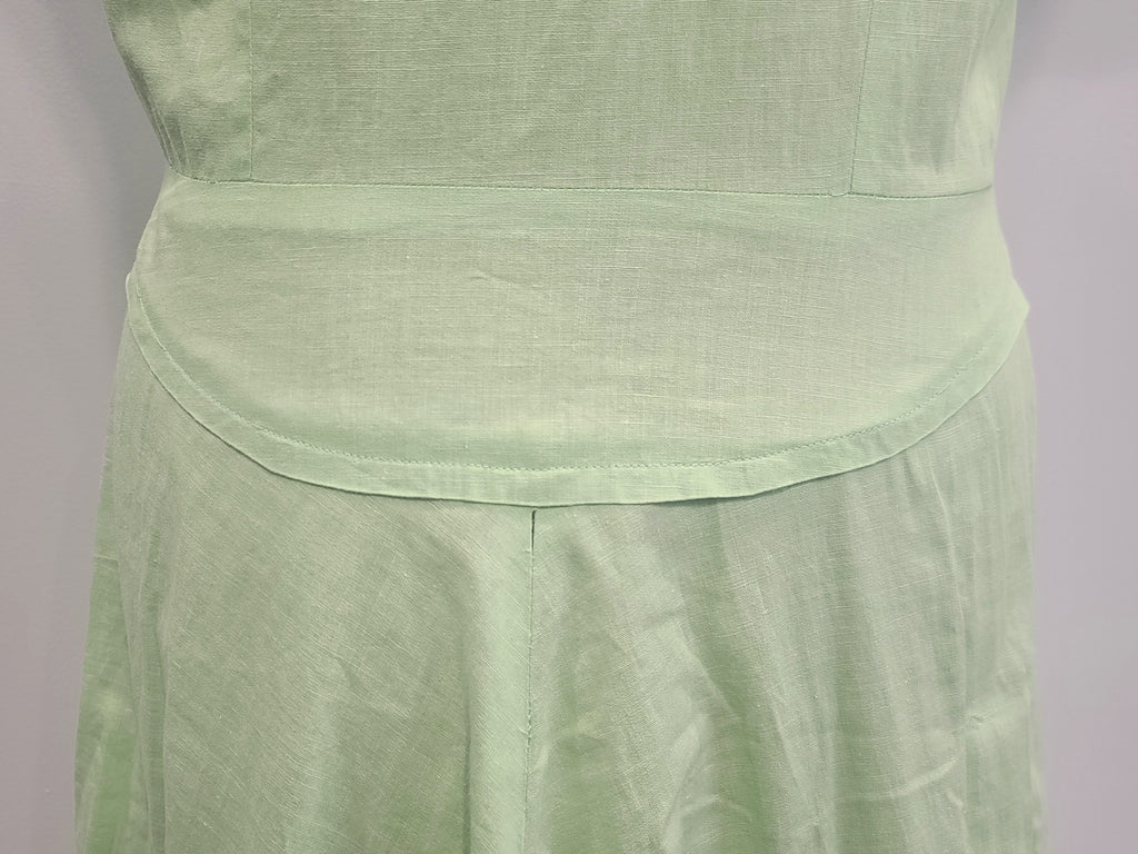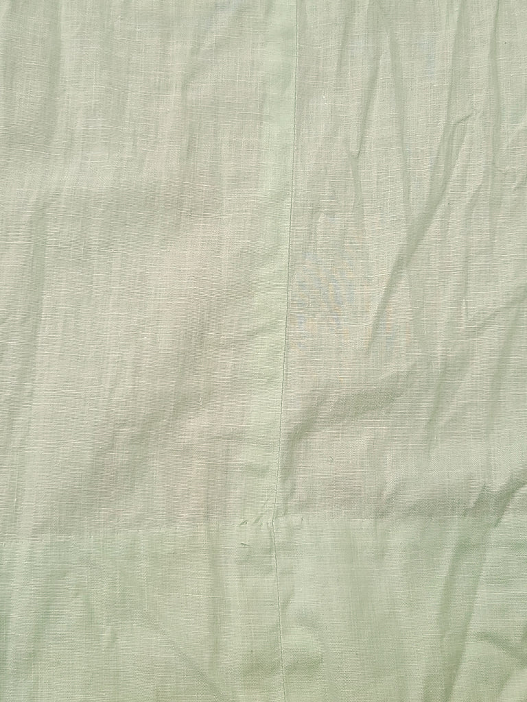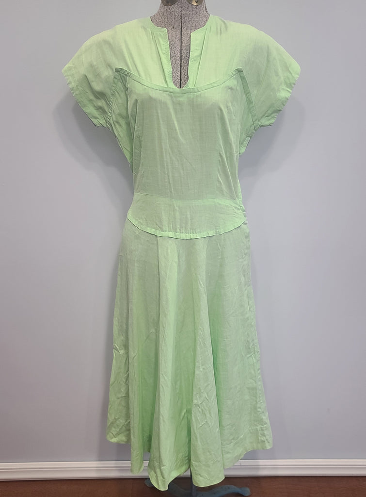 Length - 45 1/2"Nice lightweight dress. It is slightly see-through, so a slip should be worn underneath. Fairly good condition. There is some light discoloration on the side and on the shoulders. Tiny hole on one shoulder. The side zipper has some repairs. It came off the track and was put back on. It has been sewn on the bottom to make sure the zipper does not slip off the bottom. Because of the repair, the top of the zipper is slightly misaligned. This also means the side opening is a bit shorter than it was originally intended. There are a few split seams.