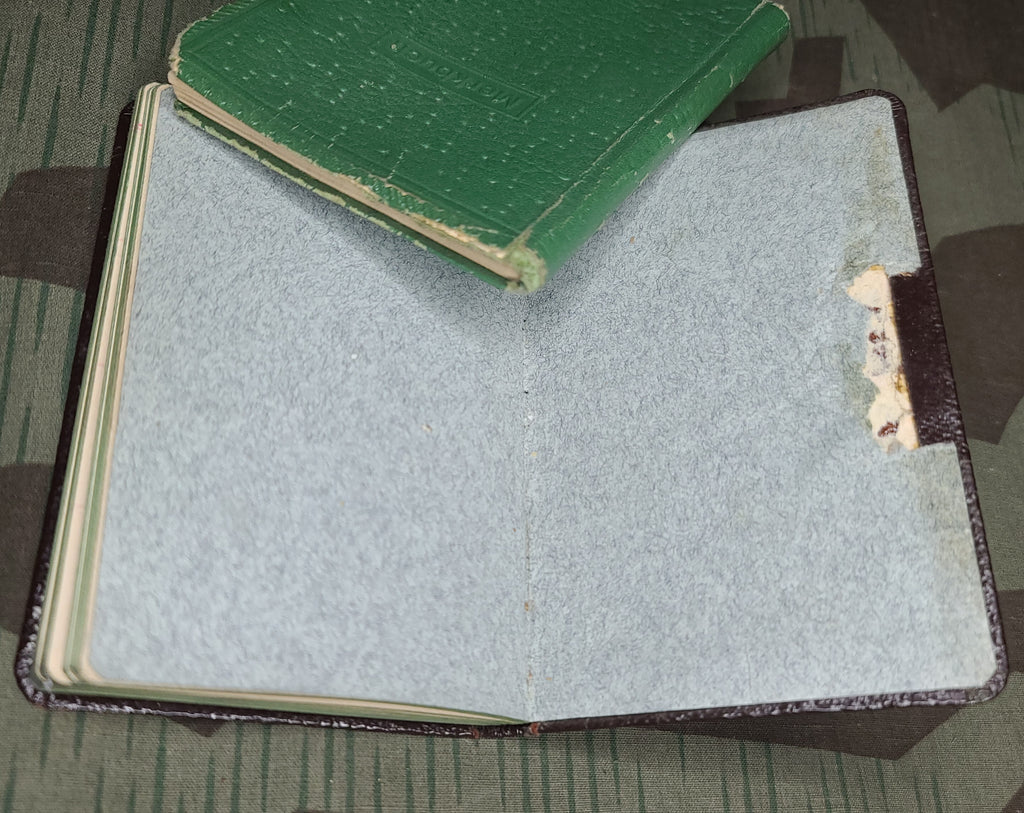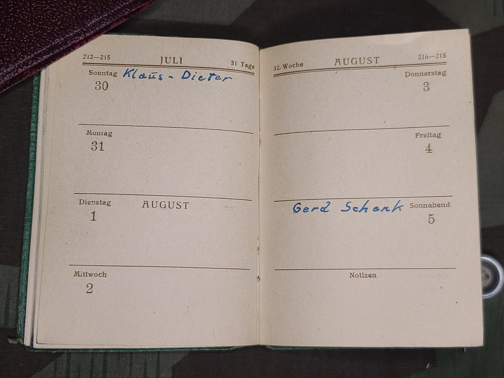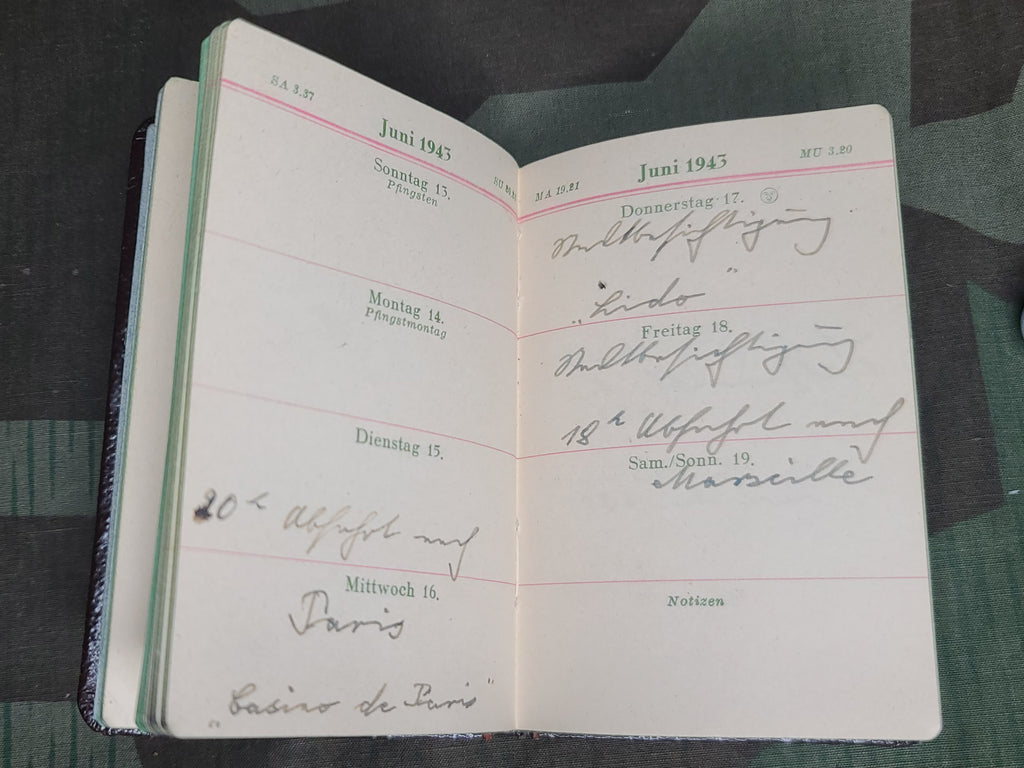 Lot of original pocket calendar books ranging from 1943 to 1945. These are all from the same man, Werner Hahnfeld. His feldpost number was F.P.10746 which seems to belong to Großdeutschland. He did not write a huge amount in these, but its still neat that they cover 3 years of his life. All books are in fairly good condition with general wear. The 1943 calendar is missing the pencil holder in the back cover. He was in Paris in June 1943.