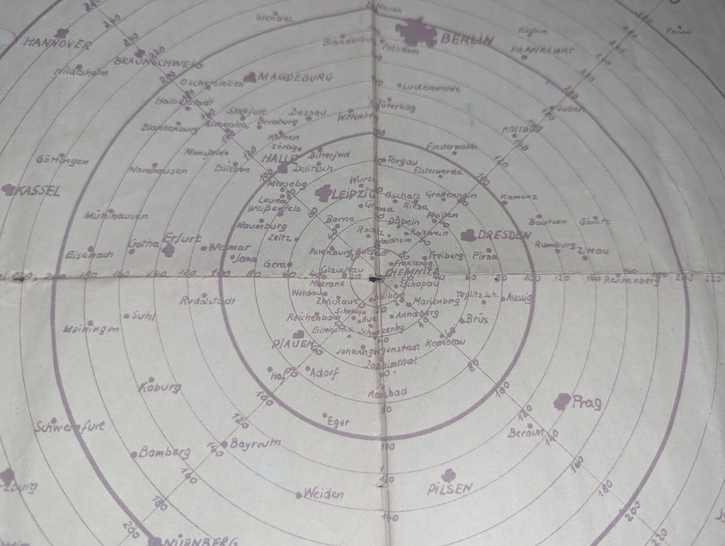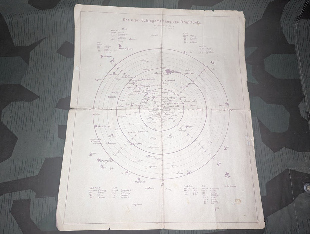 Original Luftlagemeldung des Drahtfunk air raid warning map for Chemnitz. These maps were used to determine when to sound the alarm at a local level. As bomber formations were reported, someone in Chemnitz would refer to this map to decide when or if they needed to sound the alarm. A somewhat rare Luftschutz accessory. Decent condition with some wear and age. Small tears on the edges and some discoloration. - ← Previous Product Next Product →