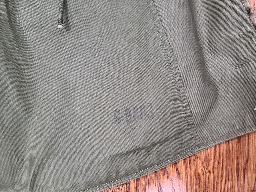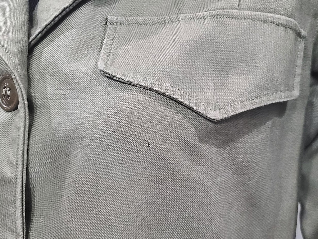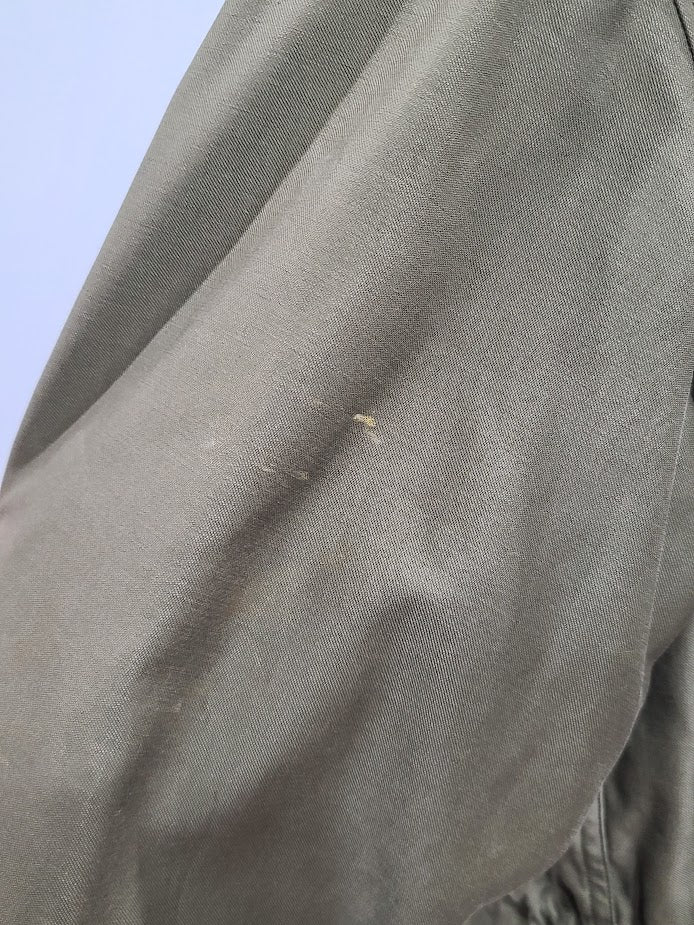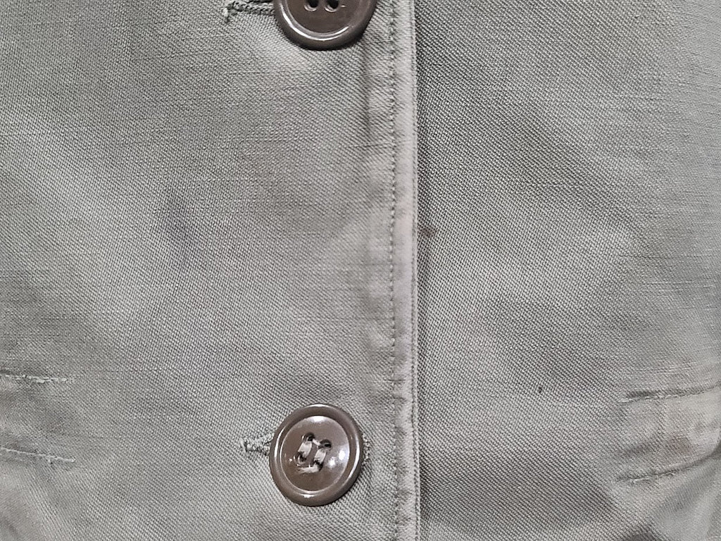 It is in fair condition, wearable but with some issues. It has some scattered light stains throughout. There are a few light yellow specks. It has not been laundered, so I am unsure if the stains will lift. It has a laundry number stamped inside G-9883. The tag in the neck is very faded and is almost completely torn out. The tag in the pocket is also faded, but is much more readable. The cuffs are in good shape and not frayed. There are shoulder pads sewn in.