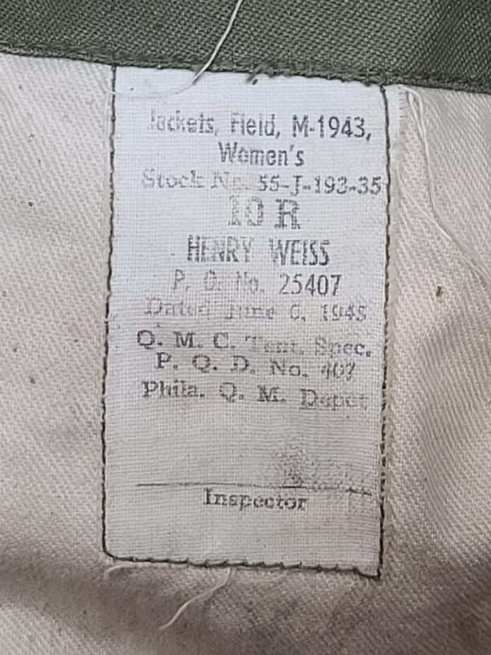 Vintage original WWII women's M43 jacket. Size 10R. Used by both WACs and army nurses. Dated 1945.