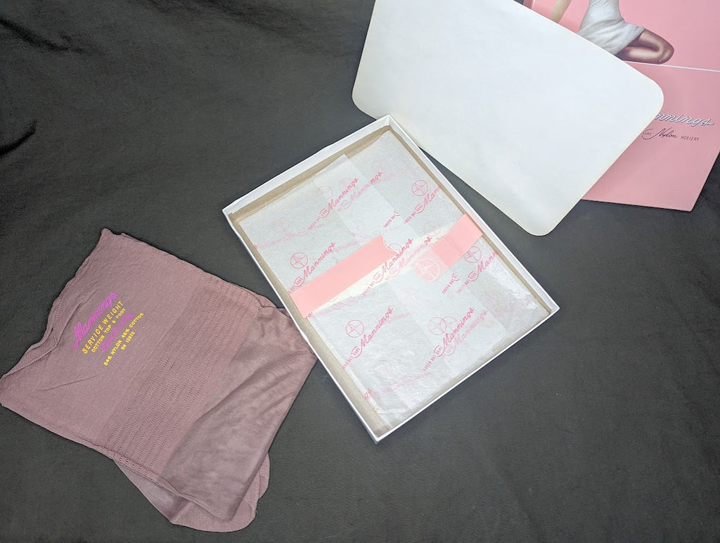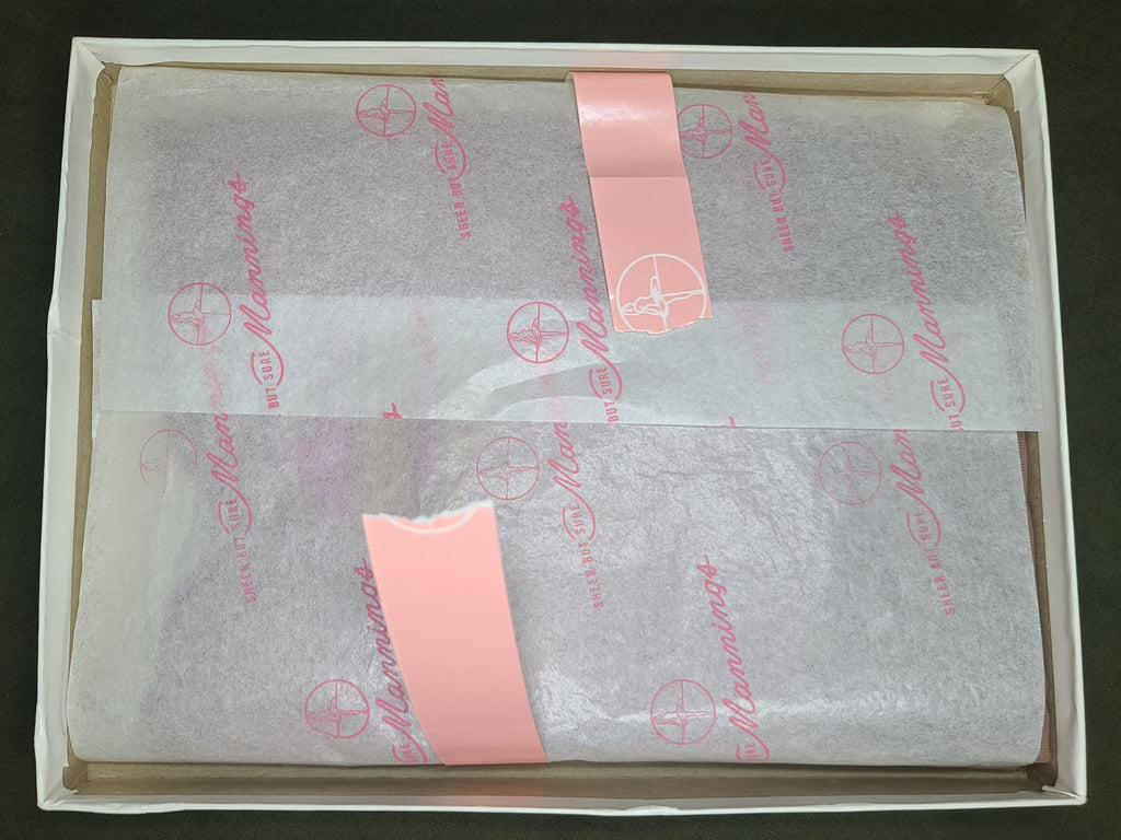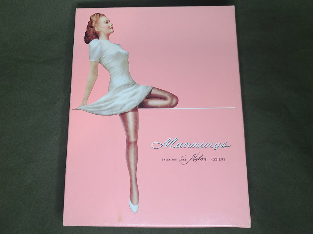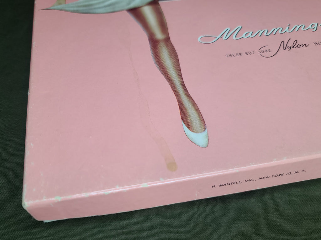 Vintage Mannings seamed stockings in their original box. There is one pair of size 11 stockings. Stocking size refers to inches of the foot NOT shoe size. Stockings are in good, unworn condition. The box shows a little wear, but is still nice overall. - ← Previous Product Next Product →