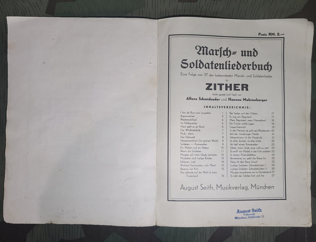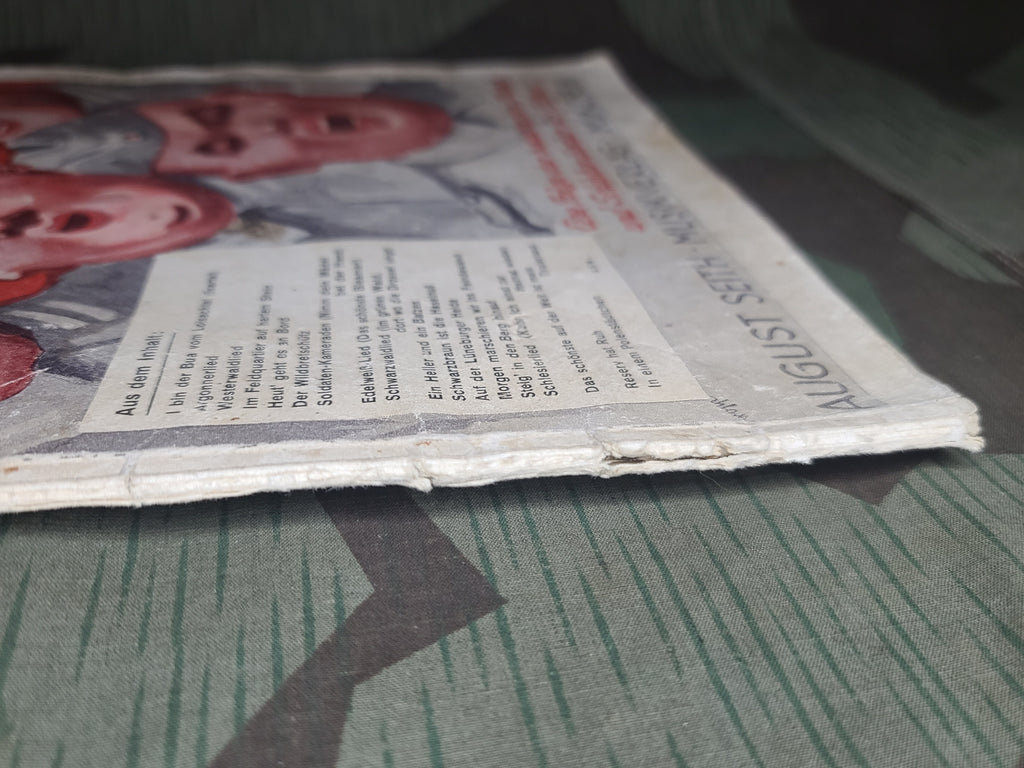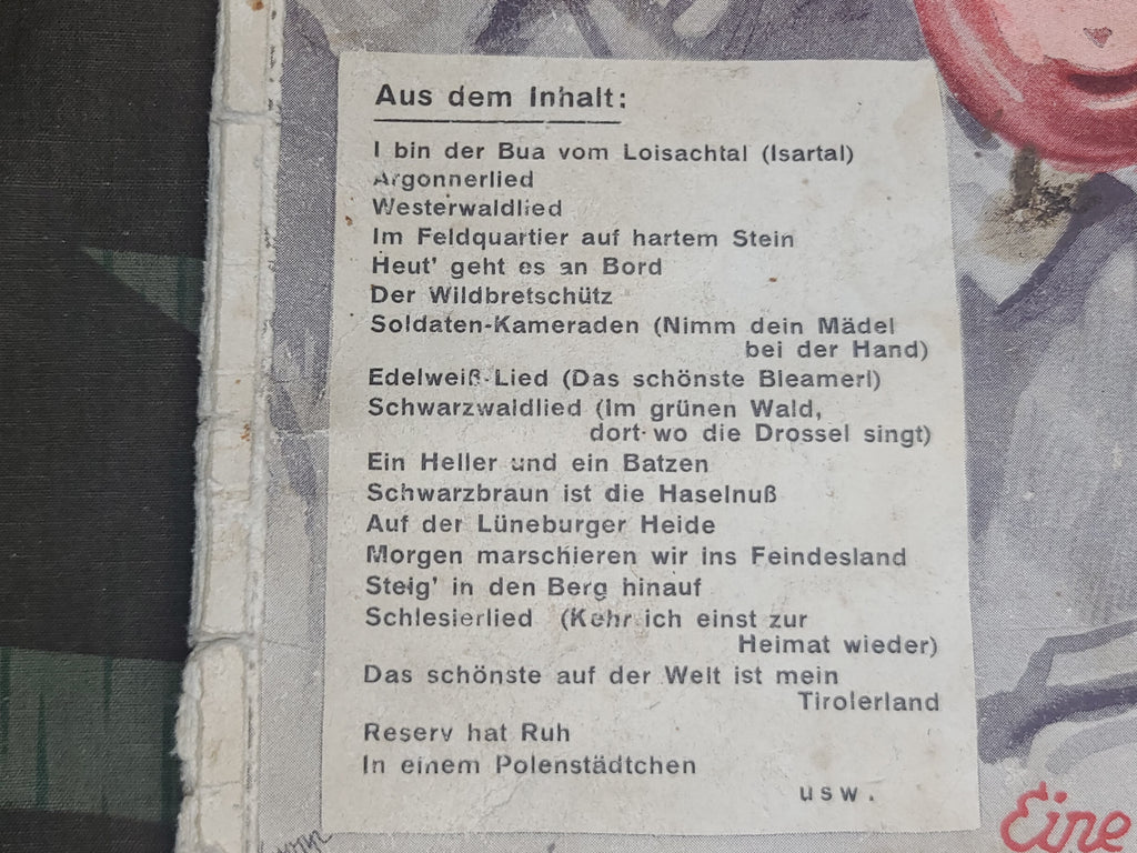Original Marsch u Soldatenlieder Buch soldier's song book for zither. Fun (and kind of creepy) cover. Lyrics and music. You don't often find music books for zither. AS-IS condition. There is a lot of wear and tear on the spine. Some loose pages and some staining.