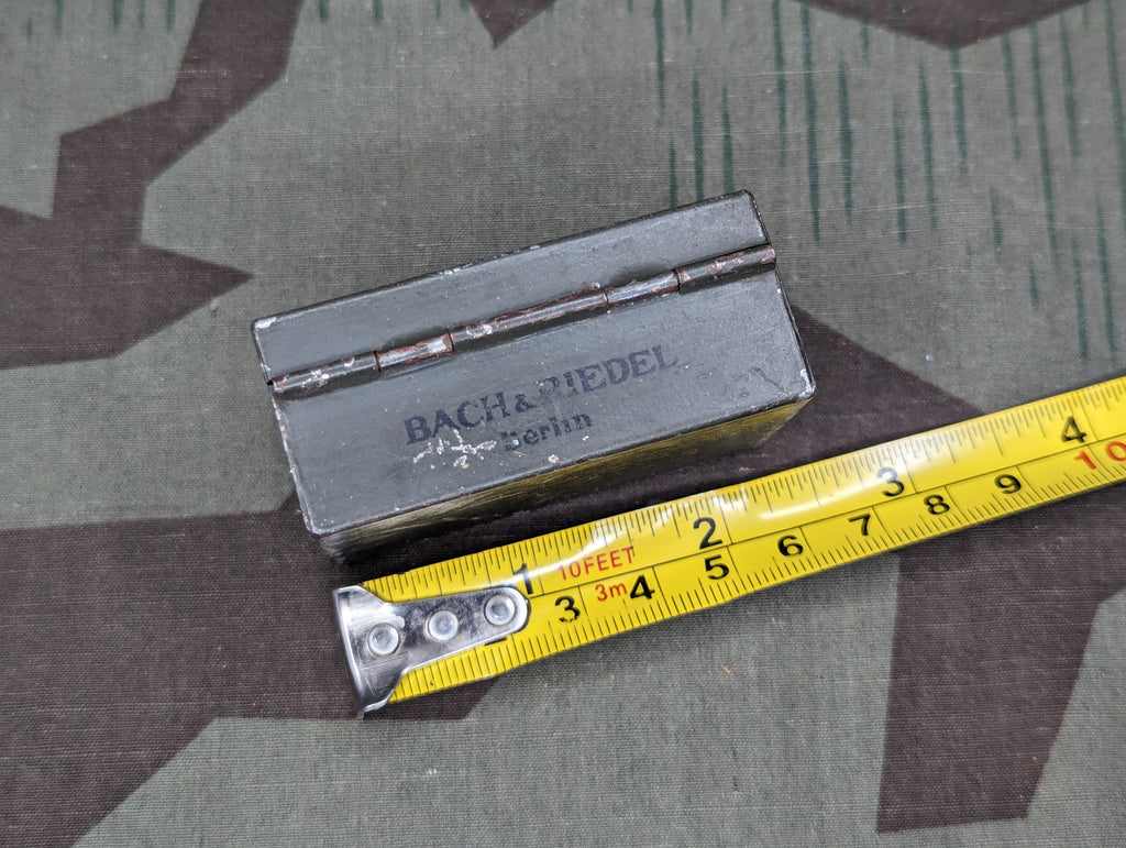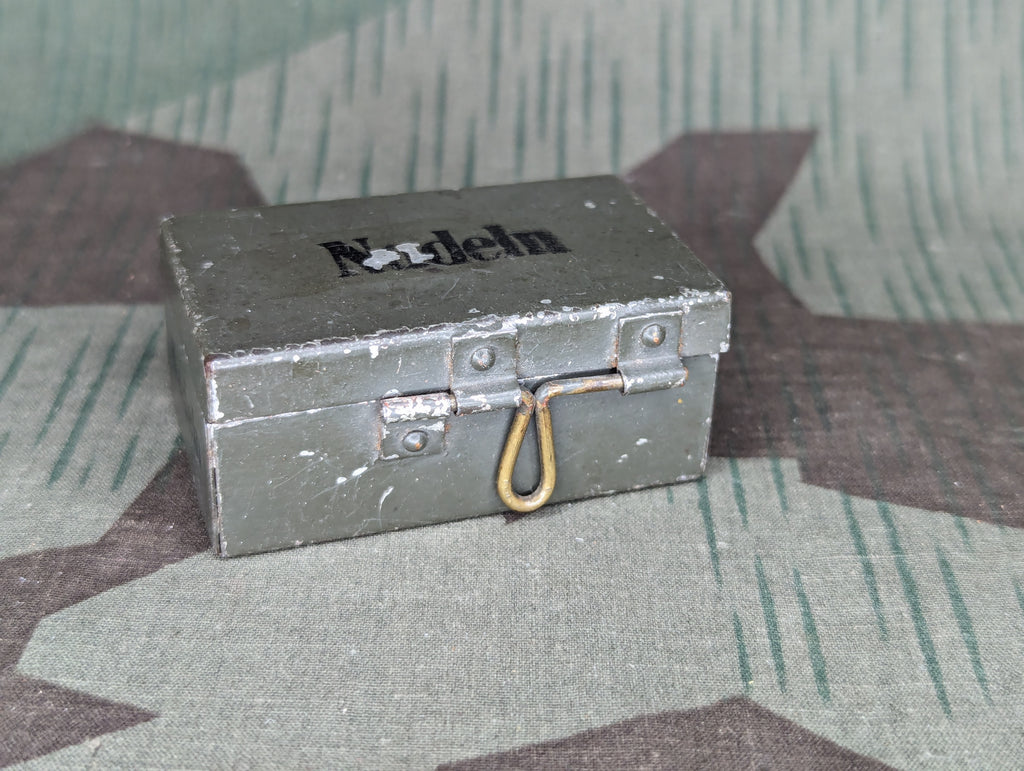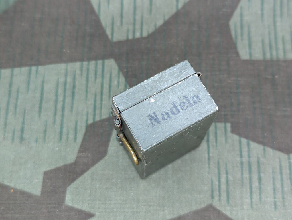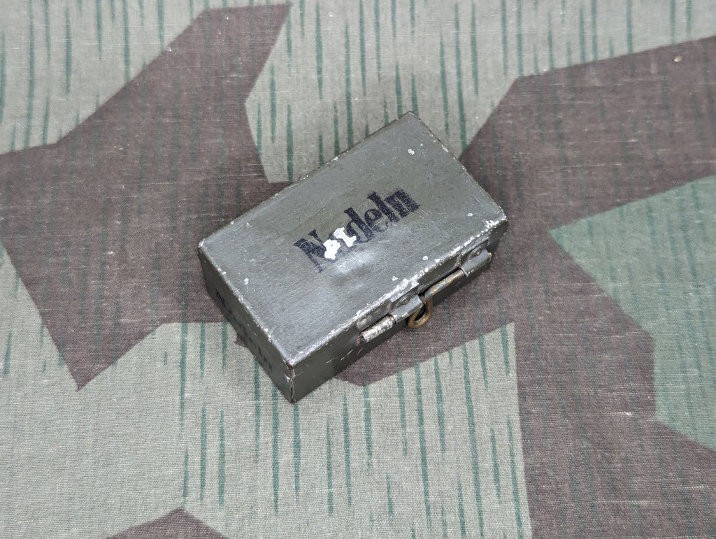 Original German wehrmacht or DRK needle tin. This would have been found in a large variety of medical kits. This one is better marked than most. Printed "Nadeln" on 3 sides with a Berlin maker mark. Does have some wear, especially on the top. - ← Previous Product Next Product →