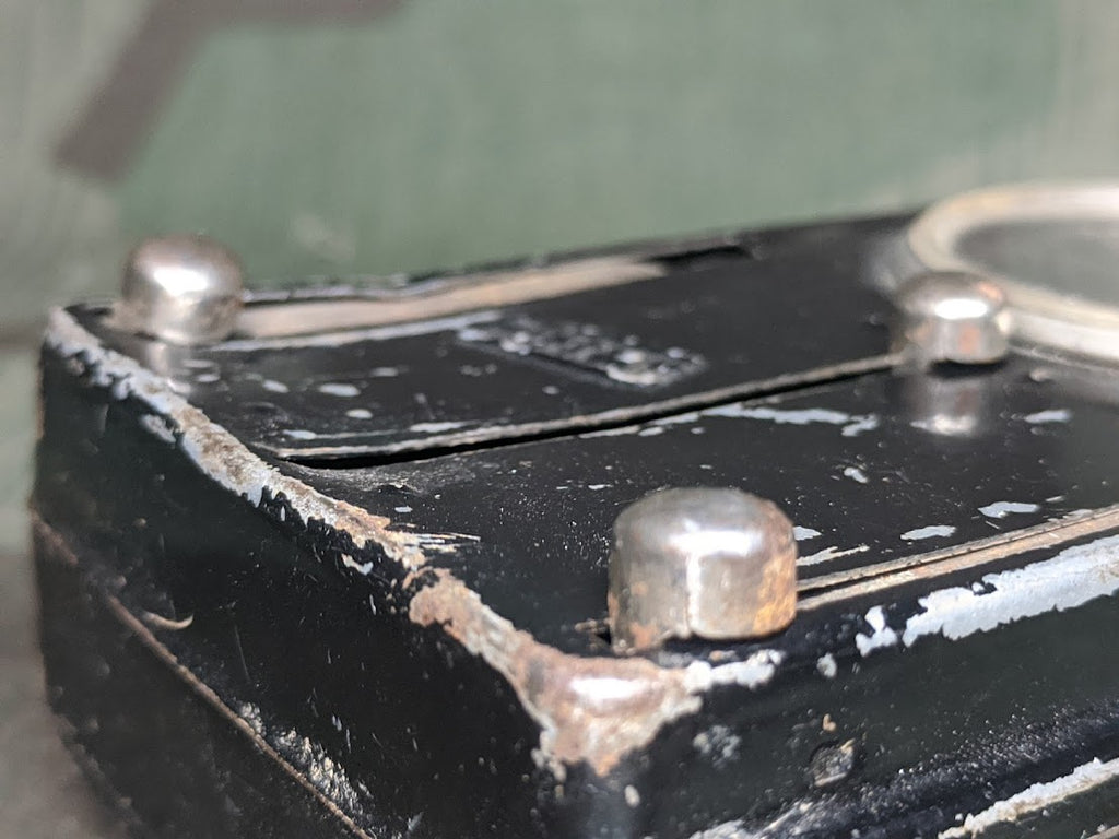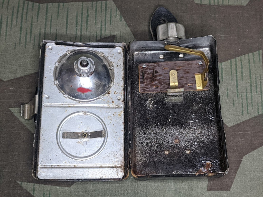 Post war flashlight which is extremely close to the WWII style. It has scratches and dents, but everything works. The face was dented in a bit which makes using the green shade a little difficult but it does still operate. - ← Previous Product Next Product →