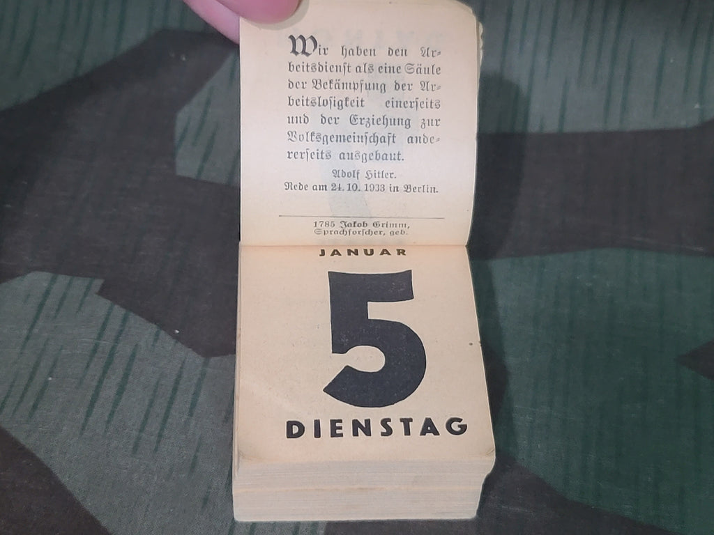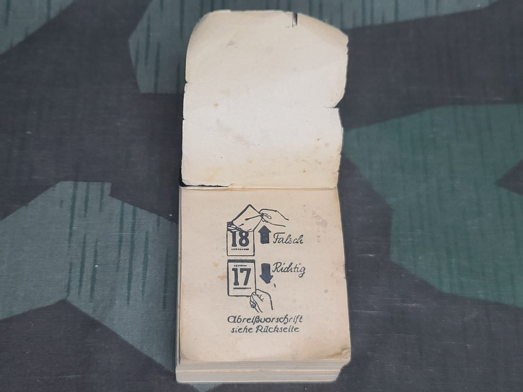 Tiny Glocken Kalendar for 1943. The calendar is unused. It does have some wear and staining, but all the pages appear to be present. On the back of each date page, there are quotes and sayings - many from Hitler.