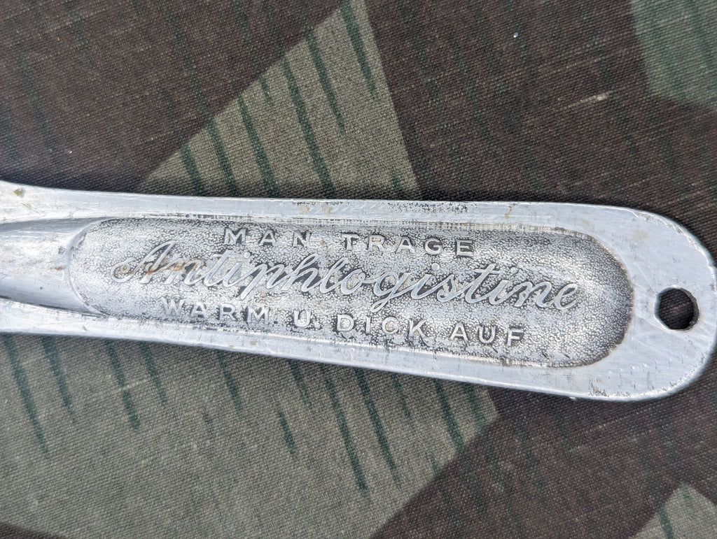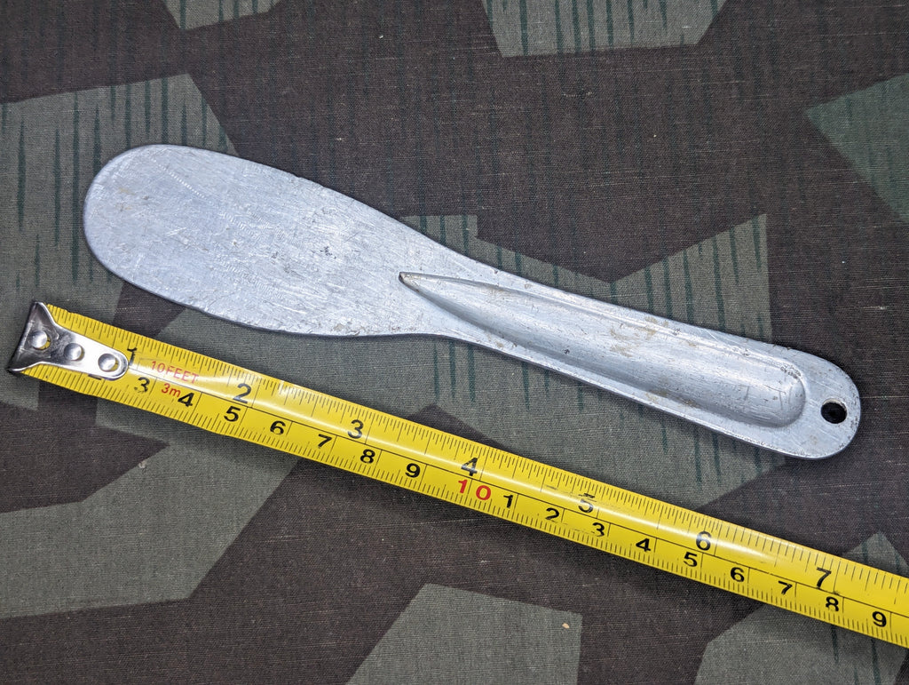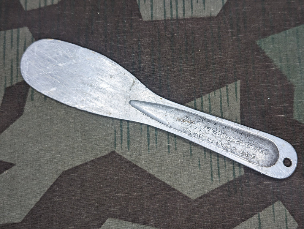 Sometimes you assume wrong. This is not actually for spreading butter or margarine of some kind, it is actually for applying high strength muscle cream. I guess it allows you to not get it all over your hands. Anyway, this could be your new Icey Hot spatula! The handle says "Man Trage Antiphlogistine Warn u. Dick Auf". OK condition with some wear.