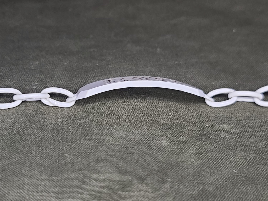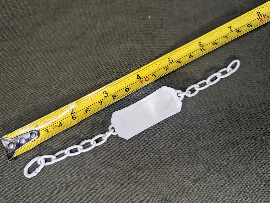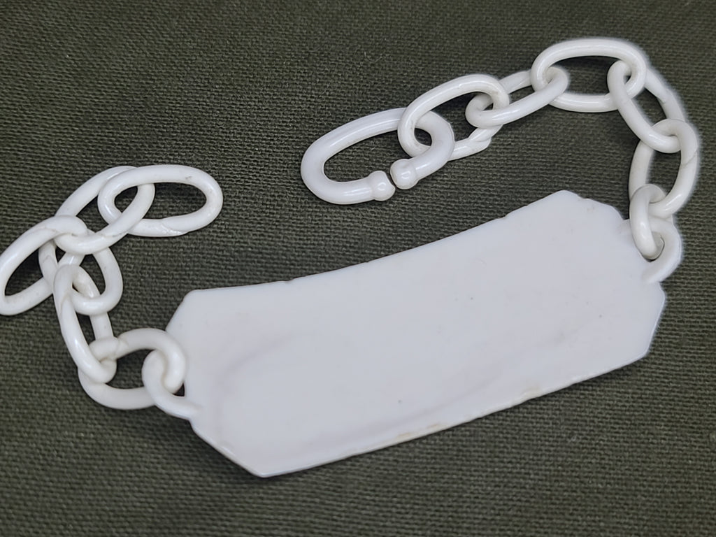 Vintage WWII "My Man in in the Navy Hands Off" sweetheart bracelet. Made completely out of an early plastic material, probably due to wartime rationing. Nice unique piece. It is a small size (see photos). It is in good, wearable condition, but it is delicate - you can't bend the clasp too much or it could break. There is some wear to the writing and light general wear around the edges and a bit of light gray swirling in the plastic on the back. - ← Previous Product Next Product →