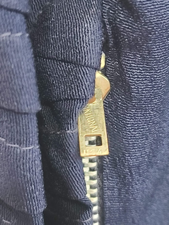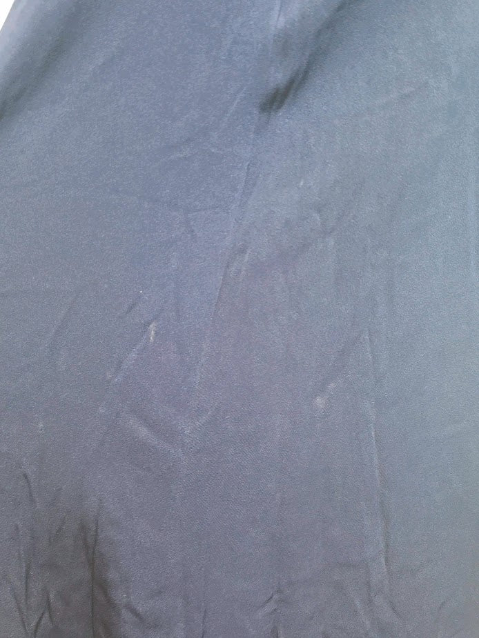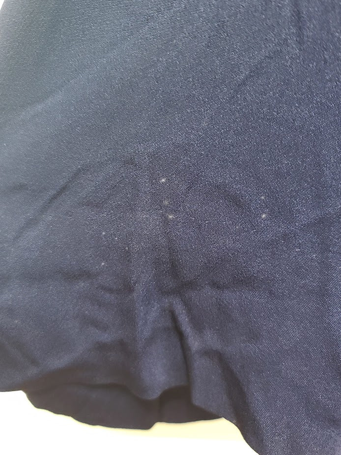 Length - 46 1/4"Nice dress with pleated designs on the blouse. Off-white flowery lace trim on the neck. There are sewn in shoulder pads. There are some stains throughout (see photos). There are some white marks on the skirt and some light discoloration under the arms. Side metal zipper (National brand). The back waist looks to have been restitched. There is a very small hole on the back above the waist. There is a split seam by the belt loop on the side. There is no belt. It does have a large hem and can be safely let down at least 2". Although the dress does have flaws, it is still wearable as-is.