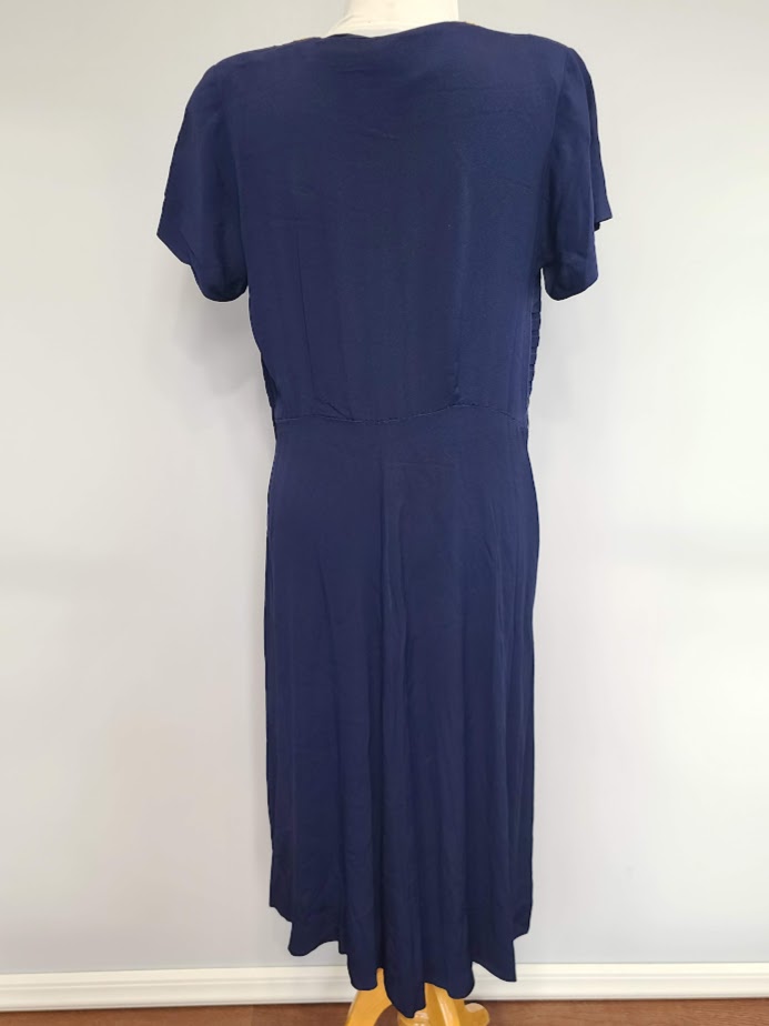 Vintage 1940s dark blue rayon dress with lace trim at the neckline.