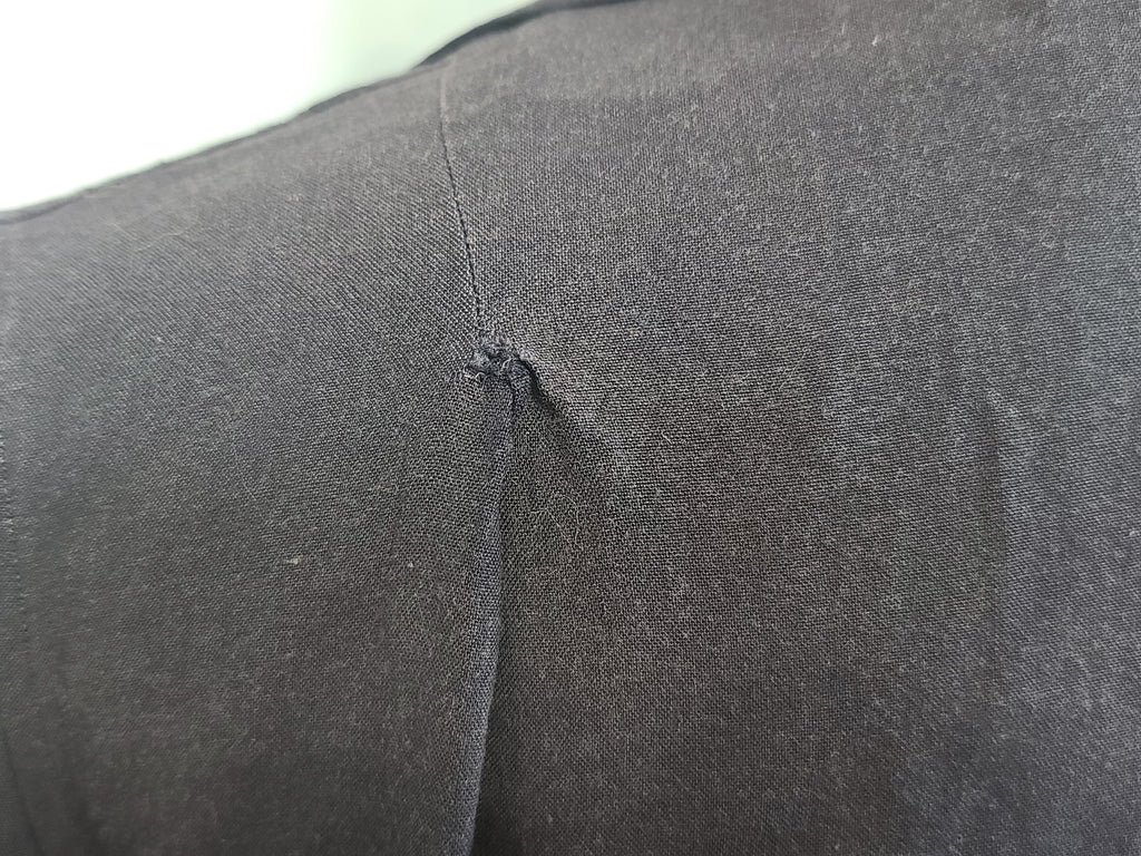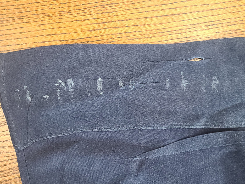 Length - 23 1/2"WAVES label and a name stamp on the inside (name stamp is hard to read). It is in overall good condition with some issues. It looks like the buttons were moved out to make the shirt fit a larger size (there are small holes where the buttons originally were). The top button is missing. The blouse looks to have been washed many times. There is some slight discoloration under the arms, but it is not too noticeable. Small pull in the material on the back.