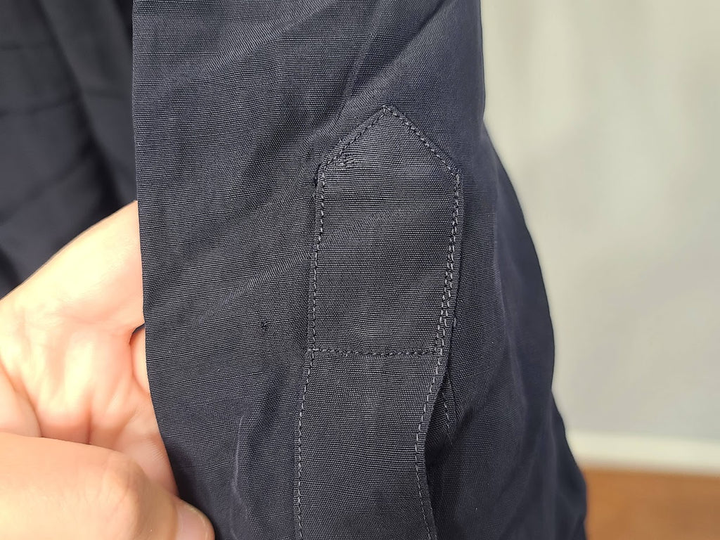 Sleeve (shoulder seam to end of cuff) - 22 1/2"WAVES labels on the inside. Marked size 18. It is in decent as-is condition with some flaws. There is a hole at the back of the neck and by the buttons for the tie on the neck. There is also a hole by the cuff. Some discoloration on the back. A few pulls in the material and some smudges. Wear on the neck.