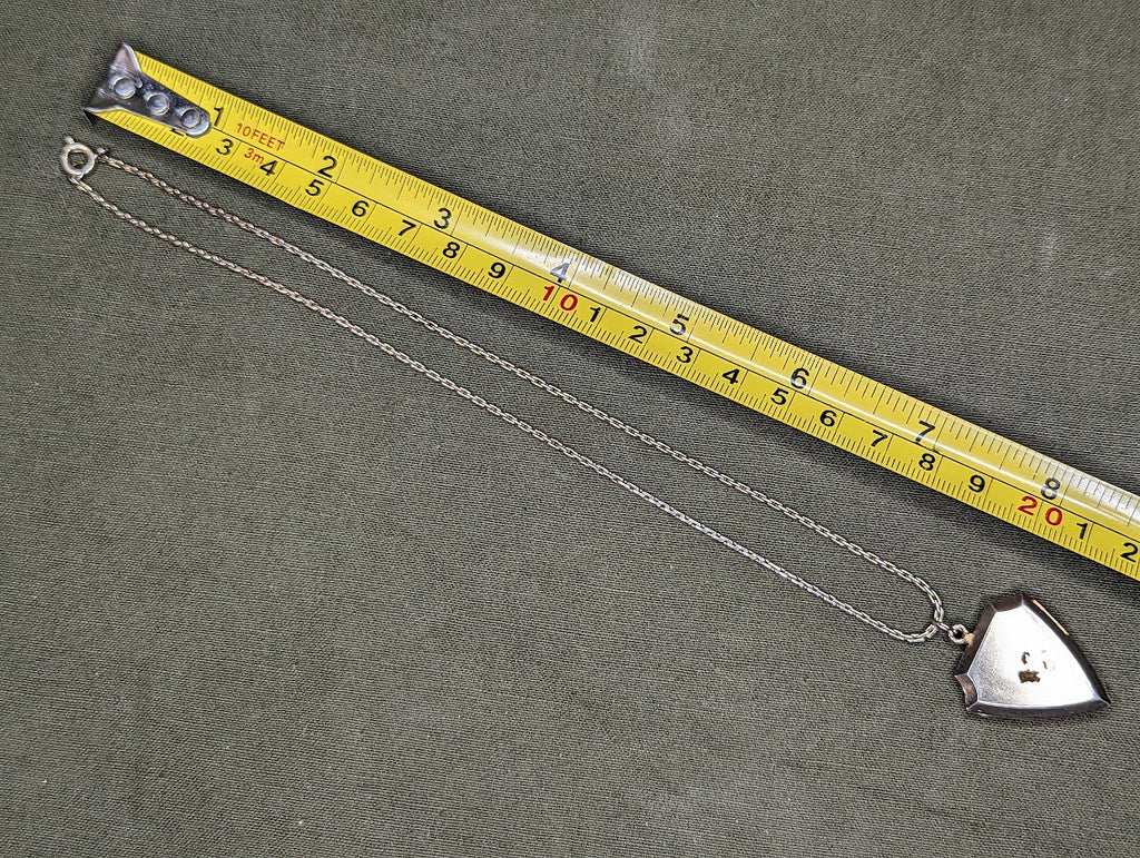 Vintage WWII US Navy officer sweetheart locket necklace. Unique shield shaped locket. Decent, wearable condition. There is a spot on the front and back as well as overall discoloration / patina. Unmarked. - ← Previous Product Next Product →