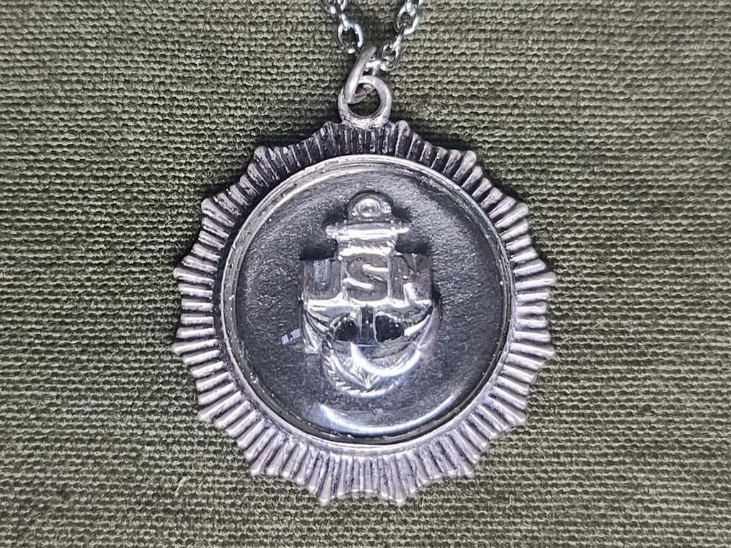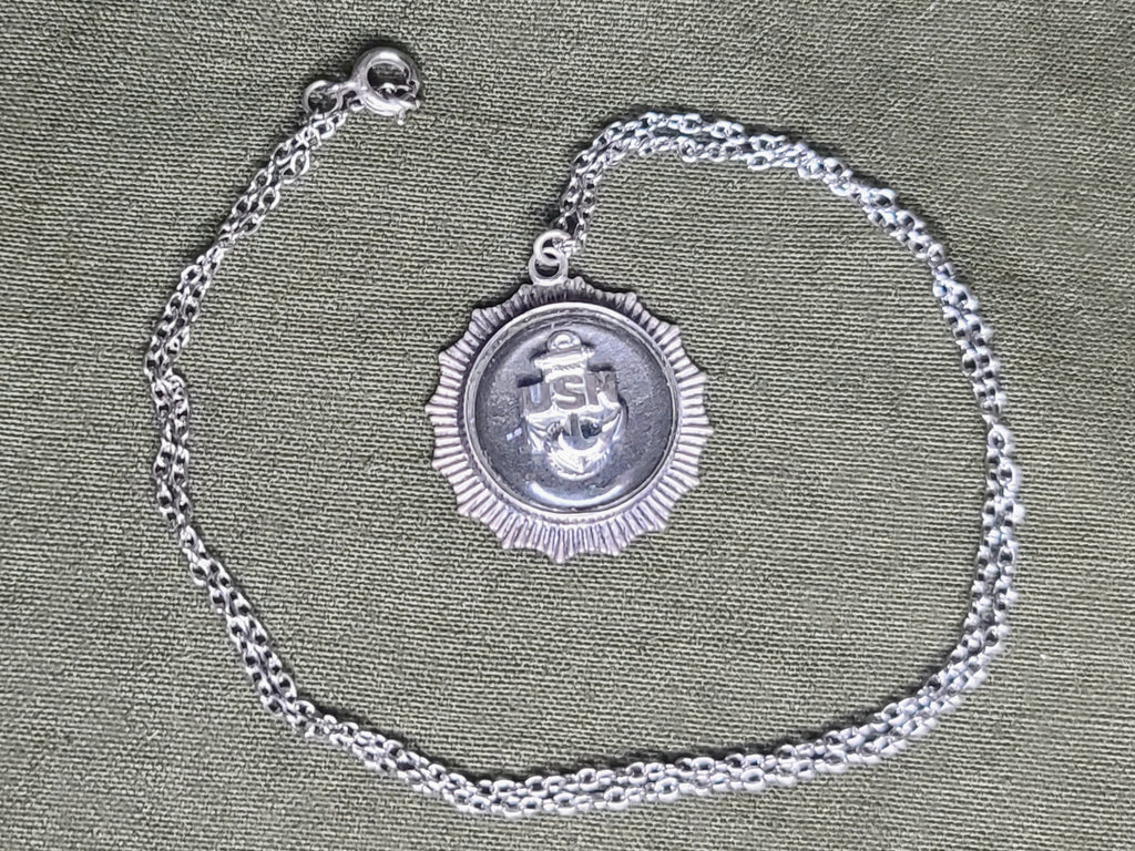 Vintage WWII US Navy domed sterling pendant necklace. The charm is marked Sterling; the chain is unmarked. Nice design and in good condition with light wear. - ← Previous Product Next Product →